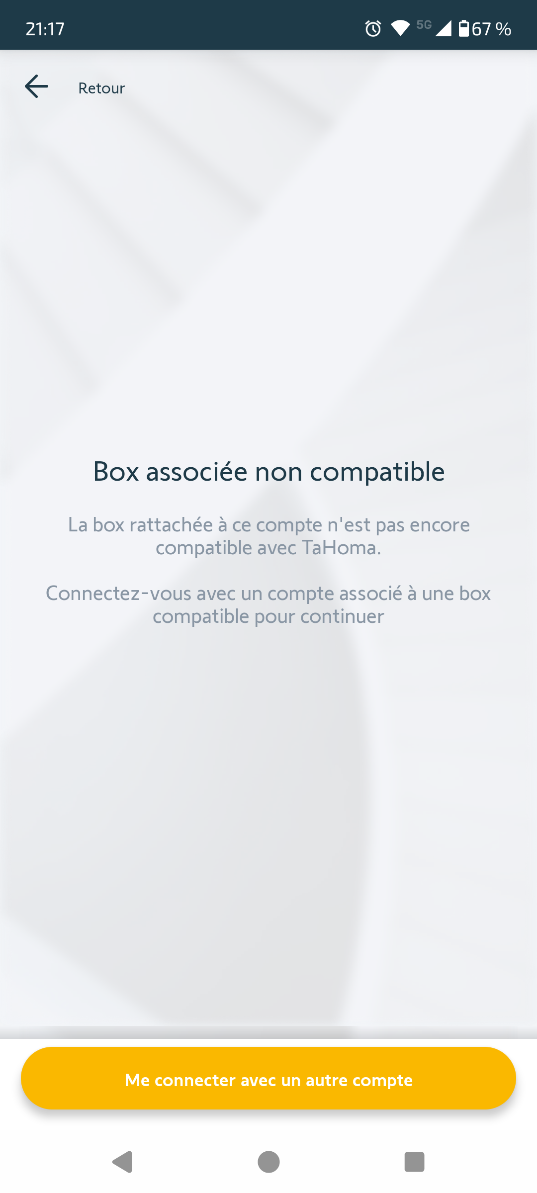 J'essaie de me connecter à ma box Tahoma à la nouvelle application mobile Tahoma, mais après la mire de connexion je retombe toujours sur l'écran d'accueil depuis la mise à jour de juin. J'arrive bien à me connecter à mon compte Somfy. Mon installation est toujours fonctionnelle via Alexa.