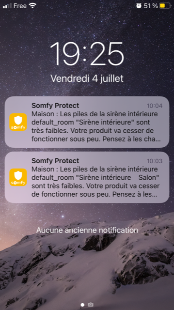Bonjour, je rencontre le même phénomène avec la sirène chez mes parents... J'obtiens des notifications pour remplacer les piles assez souvent (3,4 jours). Je les ai changé, mais je continue de recevoir les notifications bien que celles-ci n'apparaissent pas sur le log de l'application... La seconde fois j'ai contrôlé les piles car c'était curieux et elles étaient largement bonne... ce sont des VARTA INDUSTRIAL que j'utilise chez moi sans problème (durée de plus d'un an) De plus, sur l'application, le niveau de pile est au maximum... Serait-ce un bug de la plateforme ou un problème sur la sirène ?