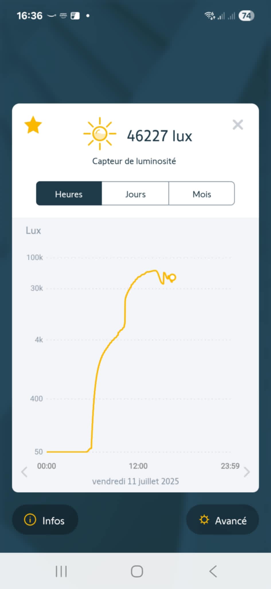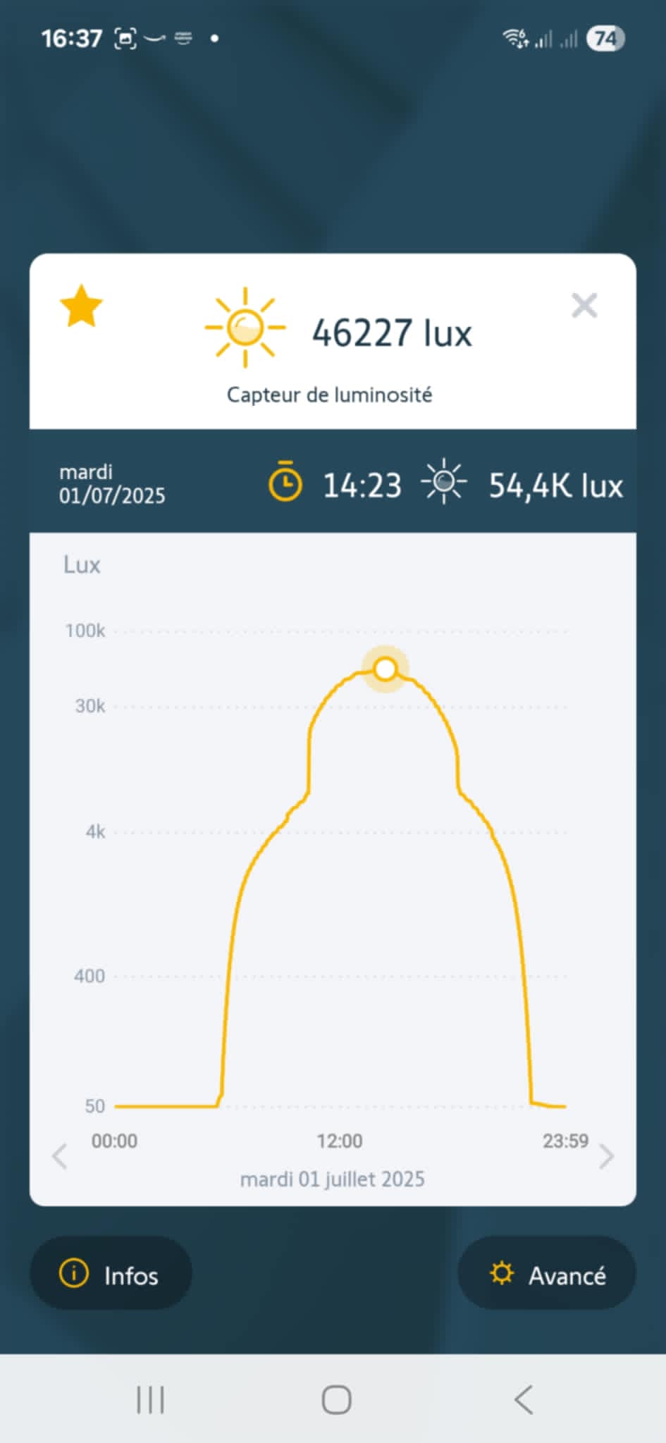 C'est ennuyeux les scénarios du coup fonctionnent plus pour certains car il ne détecte pas le plein soleil (40°C) d'il y a quelques jour le 1er Juillet moins de 60KLux....