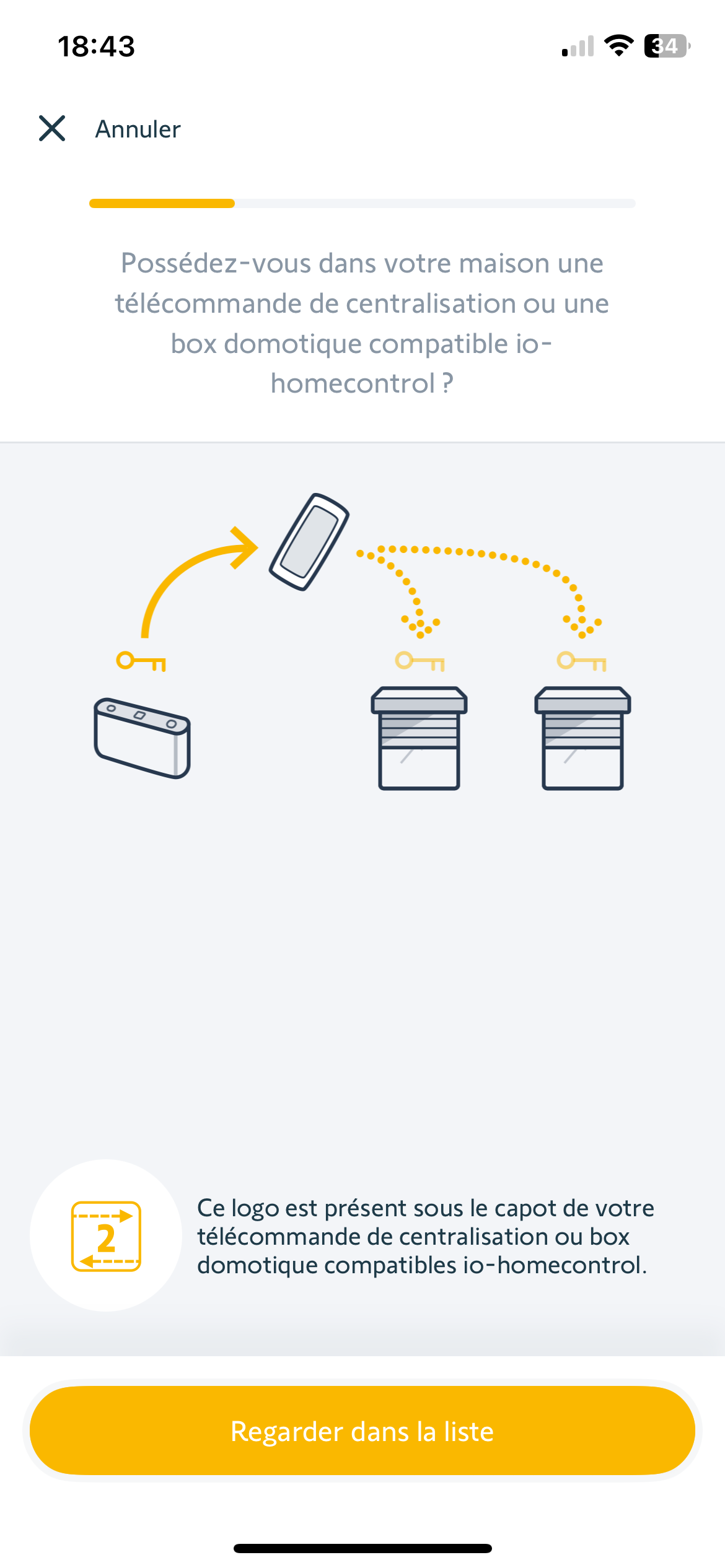 Par contre, je n’arrive pas à rajouter mes télécommandes amy sur l’appli pour pourvoir voir les degrés. Alors que la première fois j’avais réussi. Lorsque je vais sur l’application tahoma et que je mets rajouter un équipement m, je vais sur télécommande amy, on me demande un appui bref sur le bouton prog, cela lance la recherche et au final j’ai aucun produit n’a été détecté