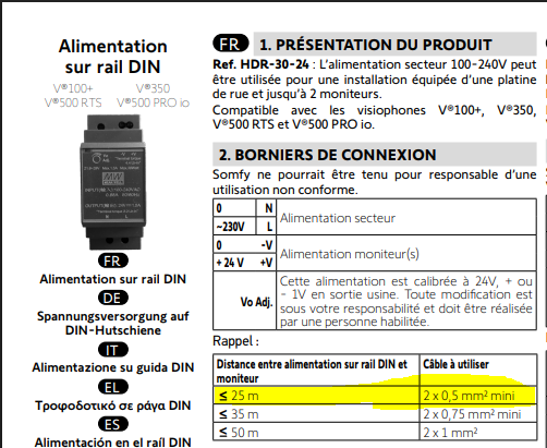 Je cherche a rallonger le câble qui sort du transfo 24 volts qui alimente un visiophone V500 connect. Je désire le prolonger pour qu'il fasse une fois fini, environ 5 ou 6 m maximum. Le bout du câble est constitué des 2 fils libres actuellement. Je comptais y souder a l'étain /épissure entre le nouveau câble et l'actuel, puis isoler au ruban électrique et passer l'ensemble dans une gaine classique pour bien le protéger. Ma question est de savoir quel section et type de câble je pouvais utiliser.