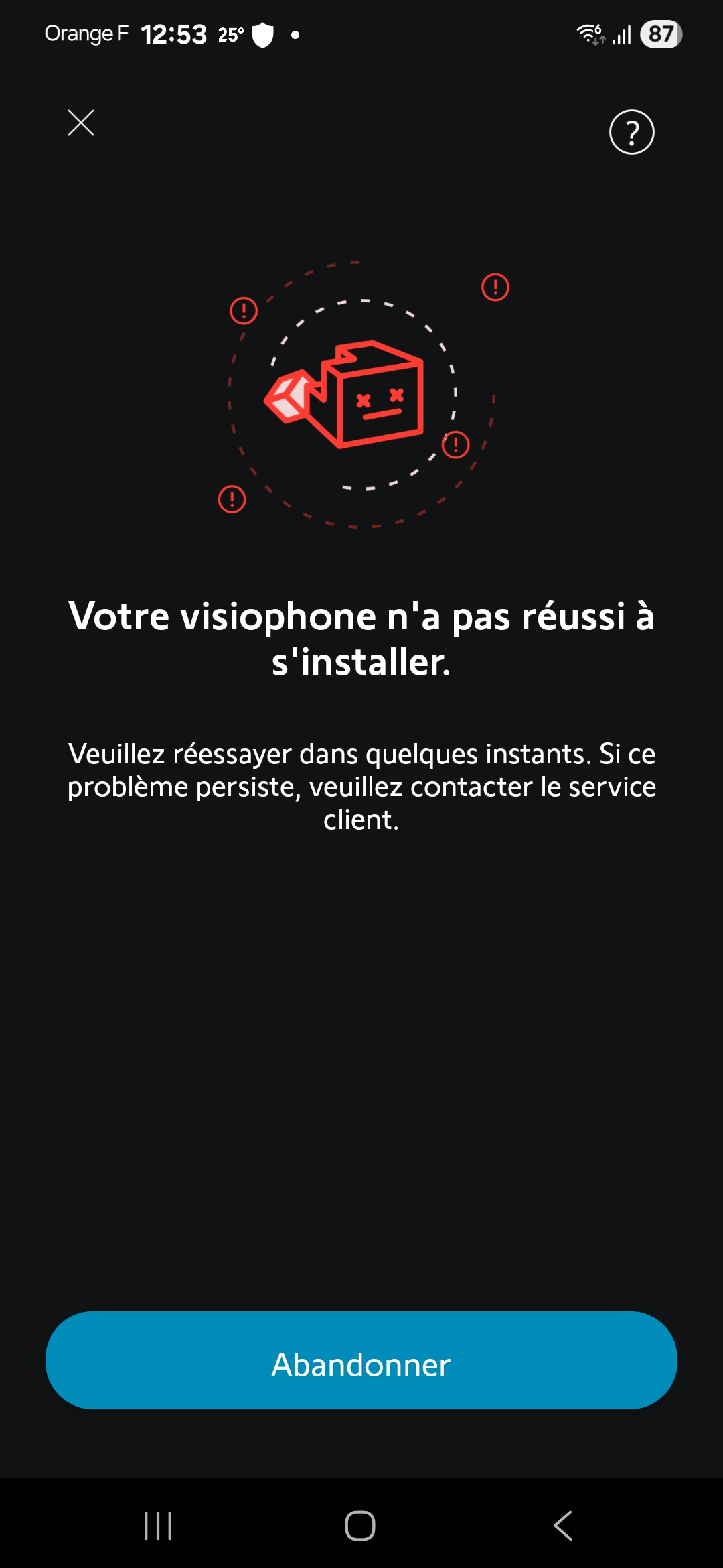 Par contre quand j'essaye de l'installer dans l'application Somfy Protect, je fais ajouter un équipement, je choisis dans la liste la V500 pro IO Connect, comme la led bleu ne clignote pas, je fais un reset et elle clignote. Je le sélectionne puis lance la connexion wifi (2,4GHz avec 5 barres) et après quelques minutes je reçois le message suivant: "Votre visiophone n'a pâs réussi à s'installer".