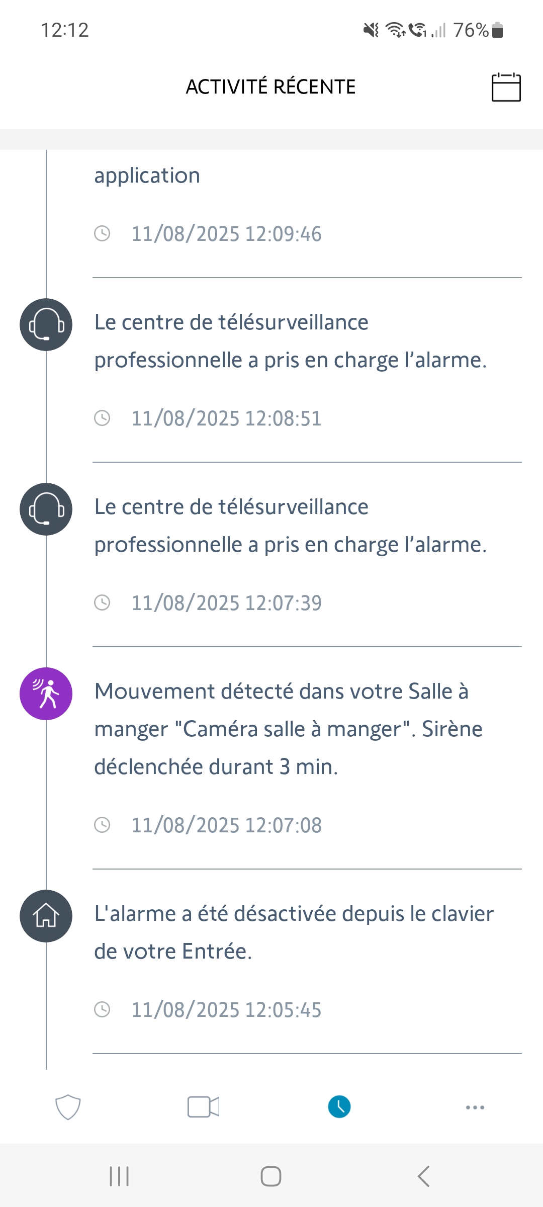 En examinant de plus près les déclenchements de votre caméra intérieure, il est fréquent qu'ils coïncident avec un désarmement de l'alarme de votre part. Cela semble indiquer que l'information concernant le désarmement met trop de temps à remonter vers le serveur, empêchant ainsi la caméra de recevoir cette information à temps. Par conséquent, la caméra vous signale que l'alarme est active alors que votre système est désarmé, ce qui entraîne des appels du service de télésurveillance sans déclenchement des sirènes.