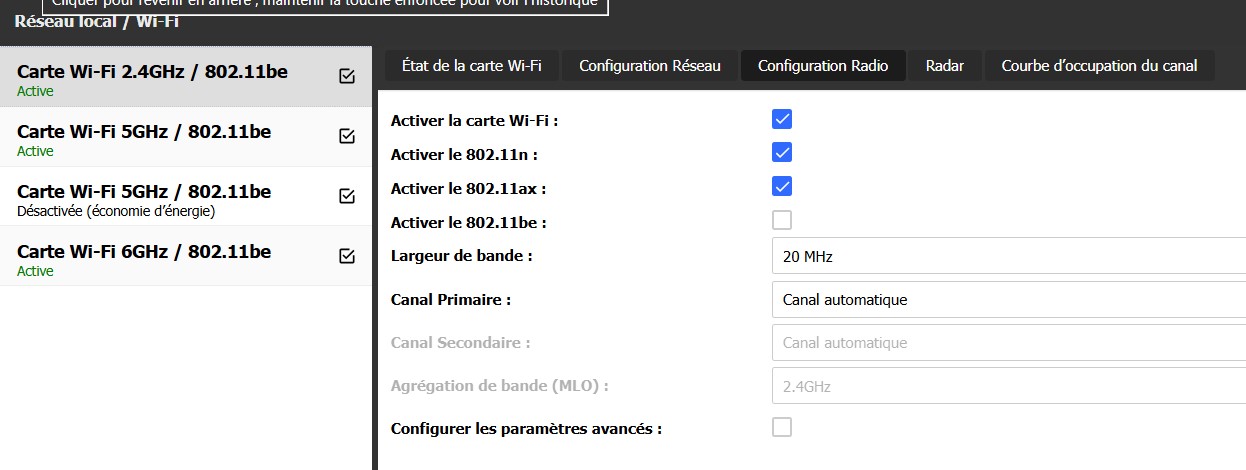Vérifier que le protocole 802.11be est bien désactiver.