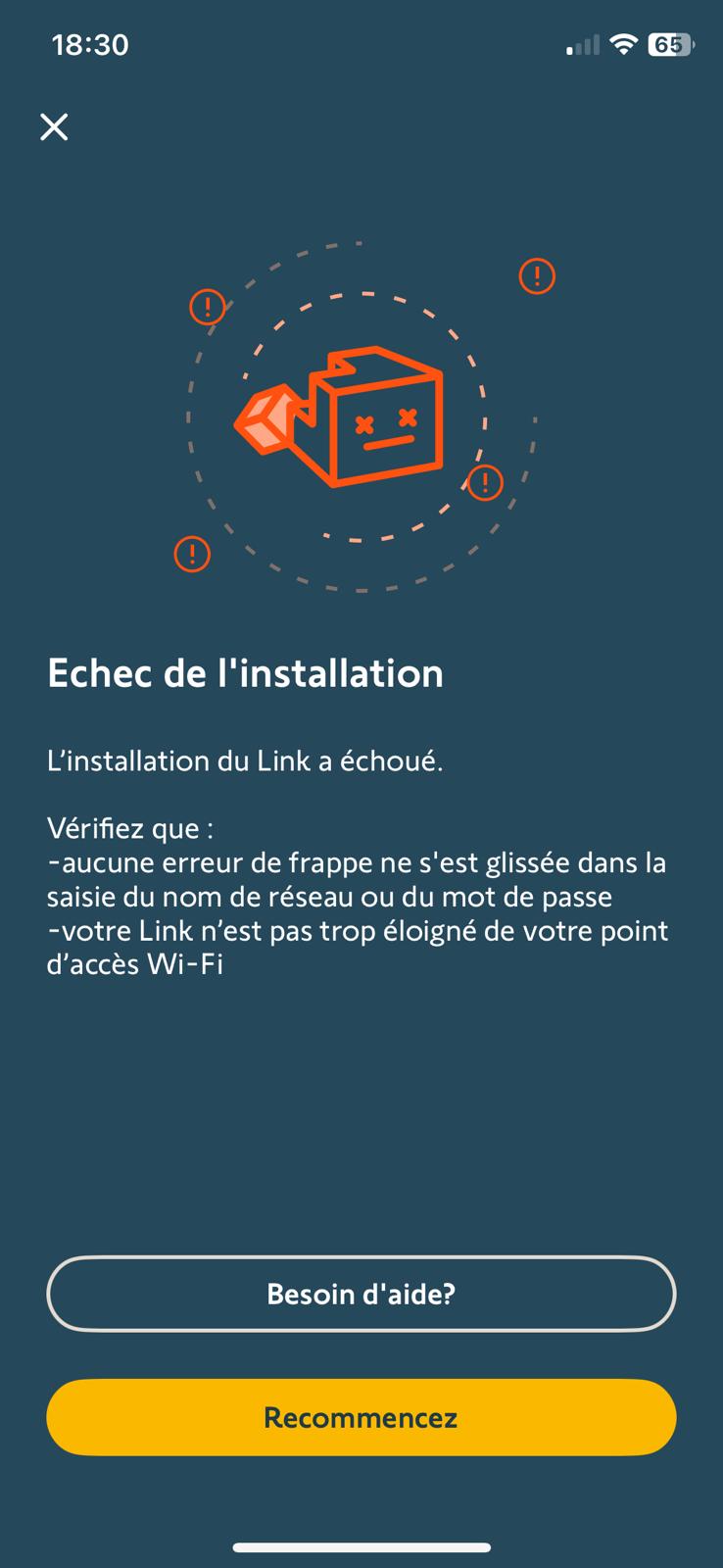 Cependant, le Link se connecte bien au Wifi mais son installation échoue à chaque fois (voir capture écran). J'ai supprimé le Link de l'application pour le réinstaller en vain ...