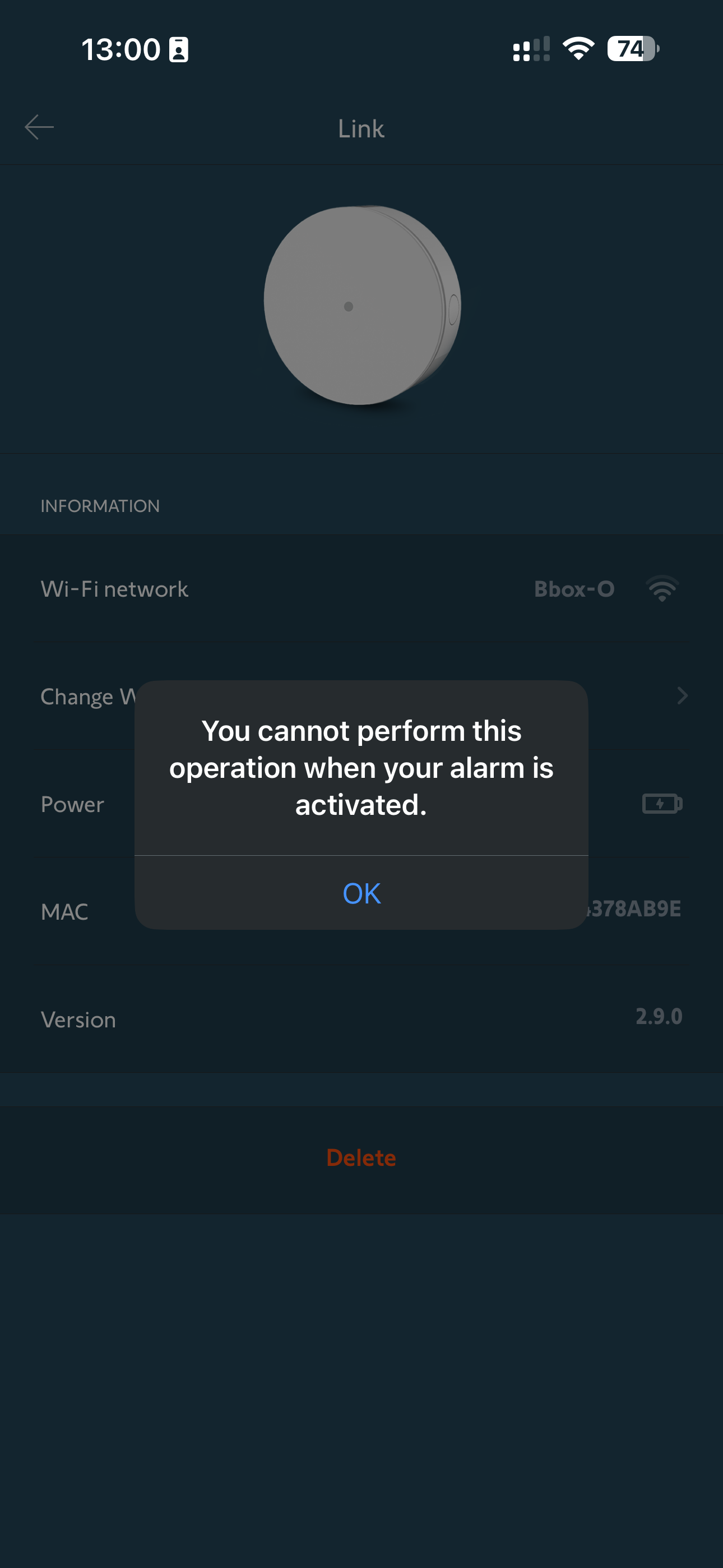 Bonjour j'ai également eu un soucis avec la perte du wifi de mon link pendant mes vacances. La box a été redémarrée a distance mais cela a changer le mot de passe de connexion au Wi-Fi du coup impossible de déconnecter l'alarme via l'application et impossible de changer le mot de passe ou de réinitialiser le link.