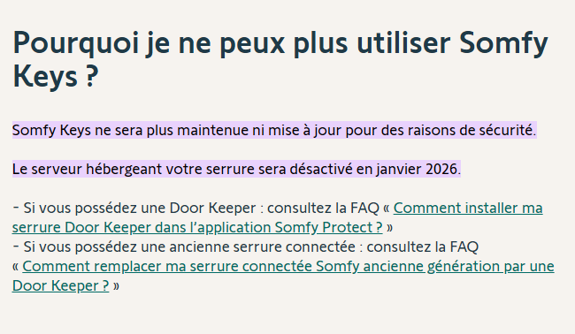 Après un échange avec le service client Somfy, on m’annonce la fin de vie de ma serrure connectée locale (sans passerelle) dès décembre 2025.