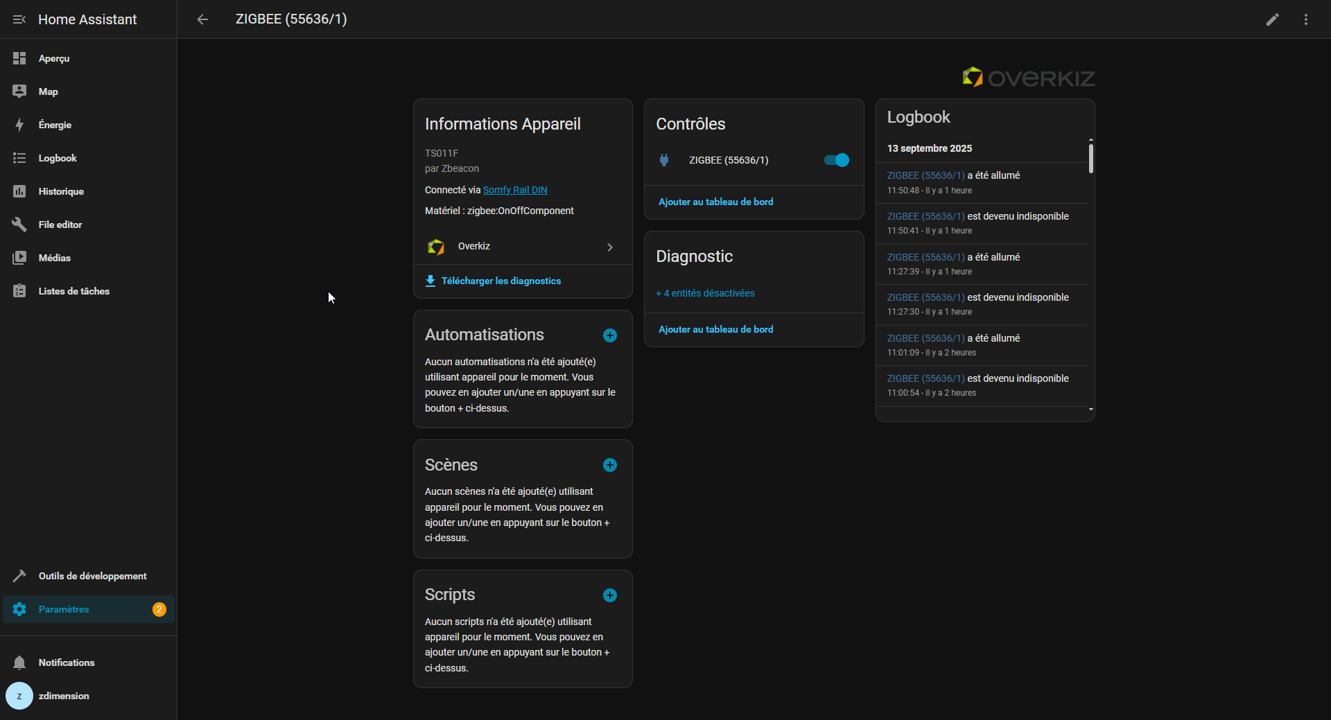 Sauf que ! Mon rail est associé à mon instance Home-Assistant via l'API locale. Et sur HA justement, je vois apparaître ma prise ! Et je peux la contrôler et voir son état ! Et cela transite bien par le rail, HA me montre que ça passe par l'intégration Overkiz. De toute façon je n'ai pas d'autre passerelle Zigbee.