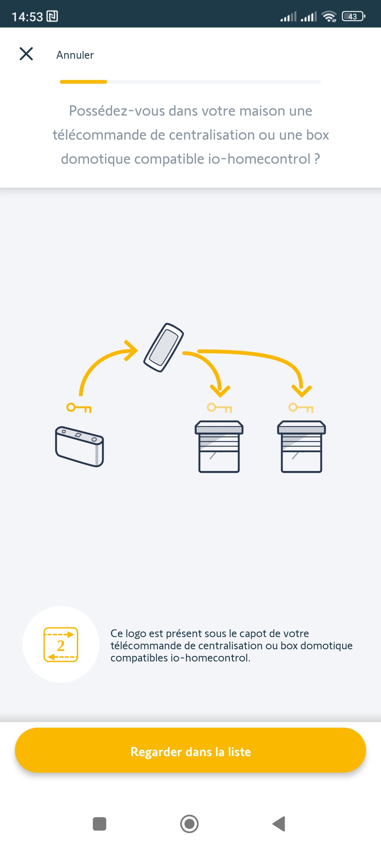 J’ai donc commencer a installé 2 volets roulants solaire sans problème sur le téléphone, par contre maintenant il ne prend plus les autres volets il me demande si je possède dans ma maison une télécommande de centralisation ou une box domotique compatible IO je réponds que oui une tohama switch et quand je fais suivant il m'a dit que je dois contacter le support pour être accompagné dans ma démarche.