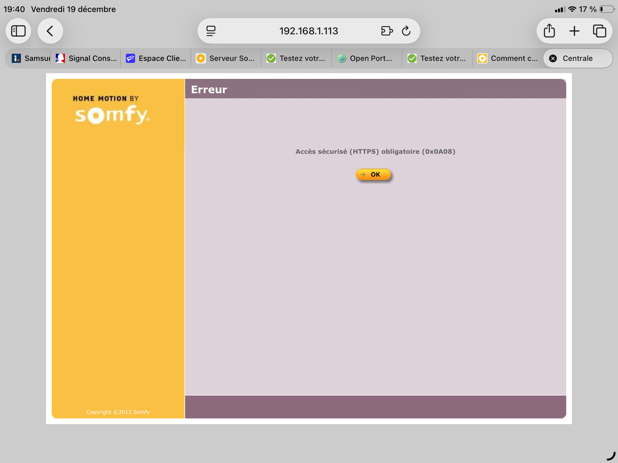 Conséquence : adresse IP du serveur Somfy indisponible, application évidemment indisponible etc.