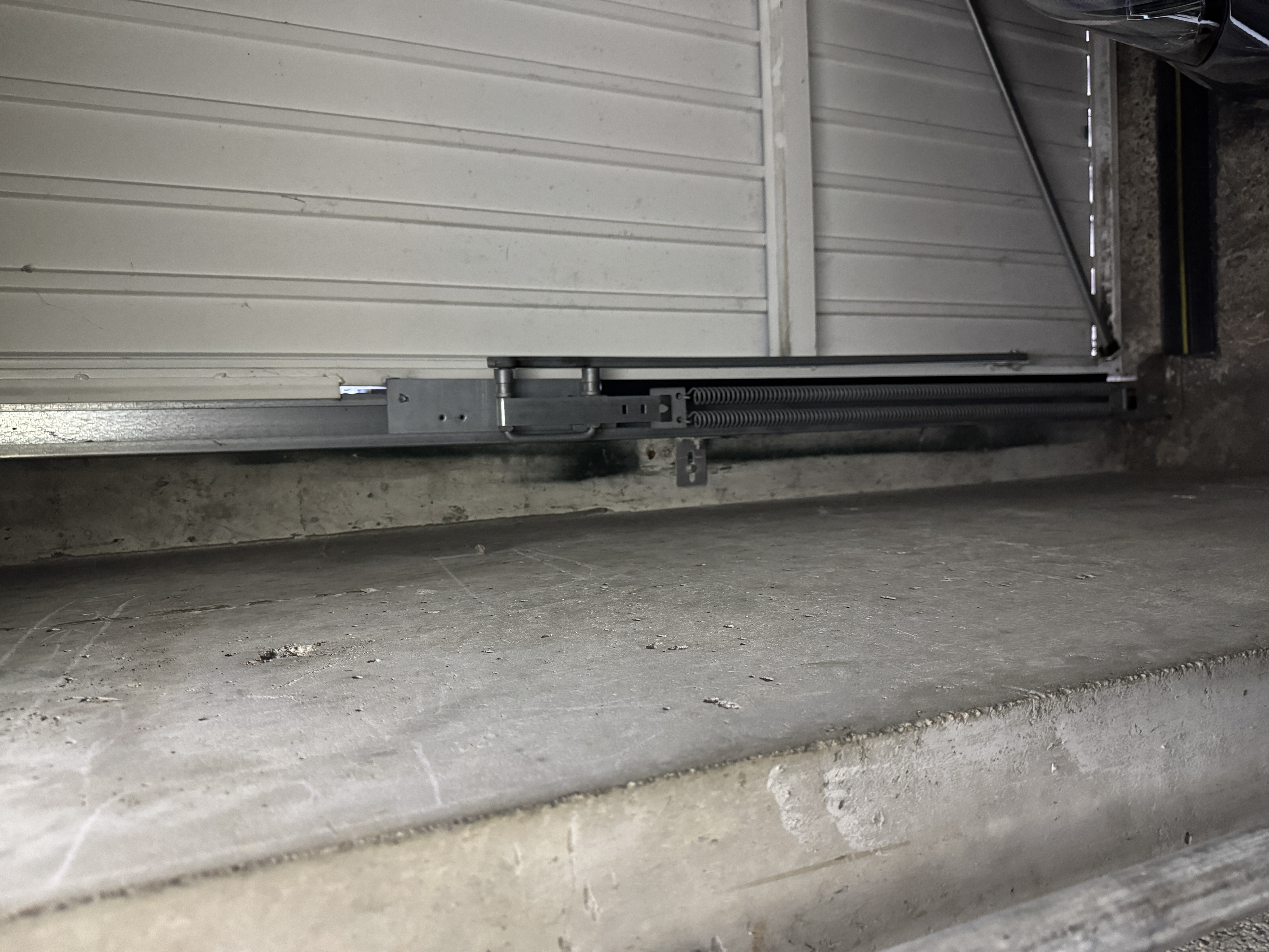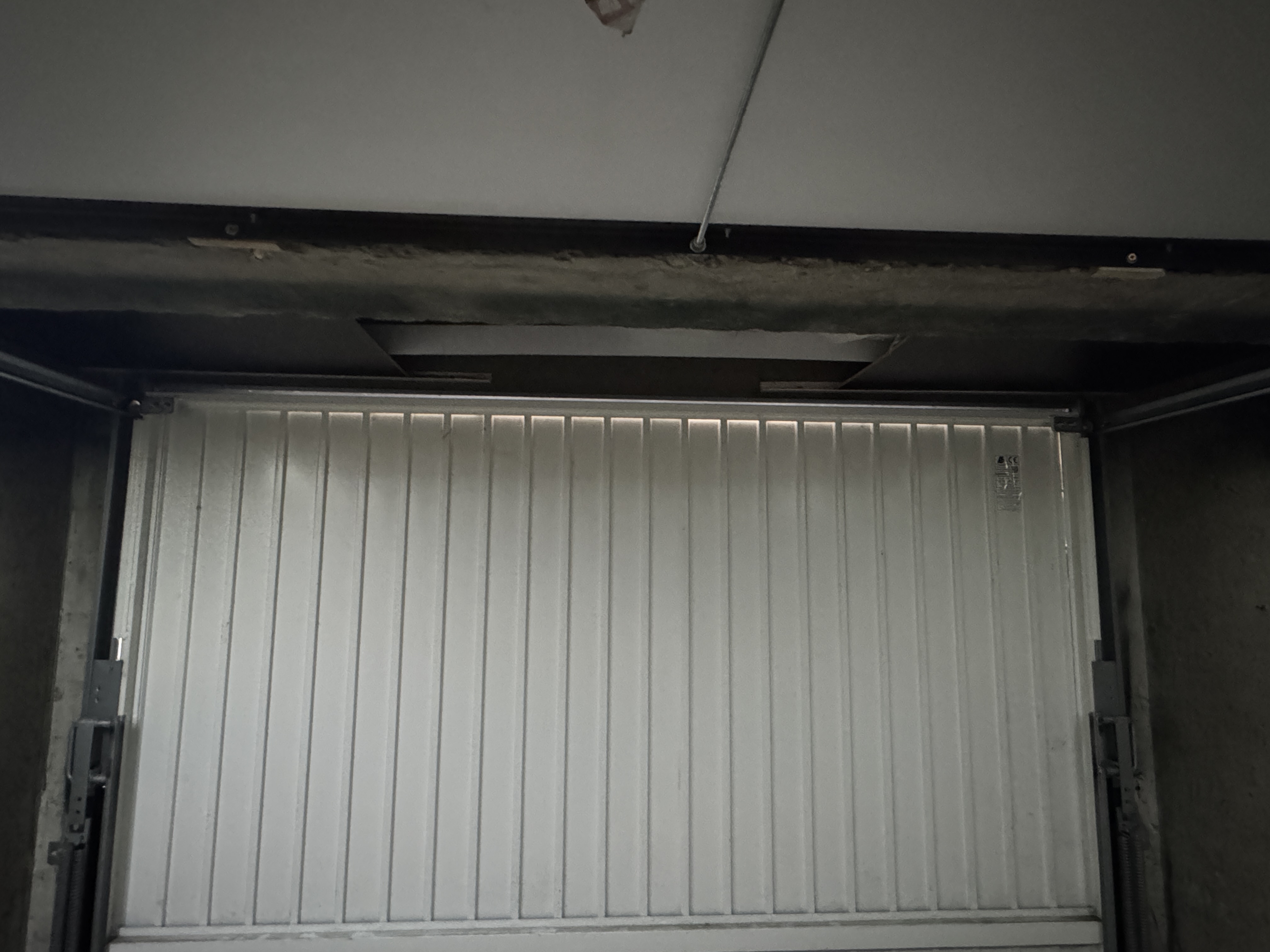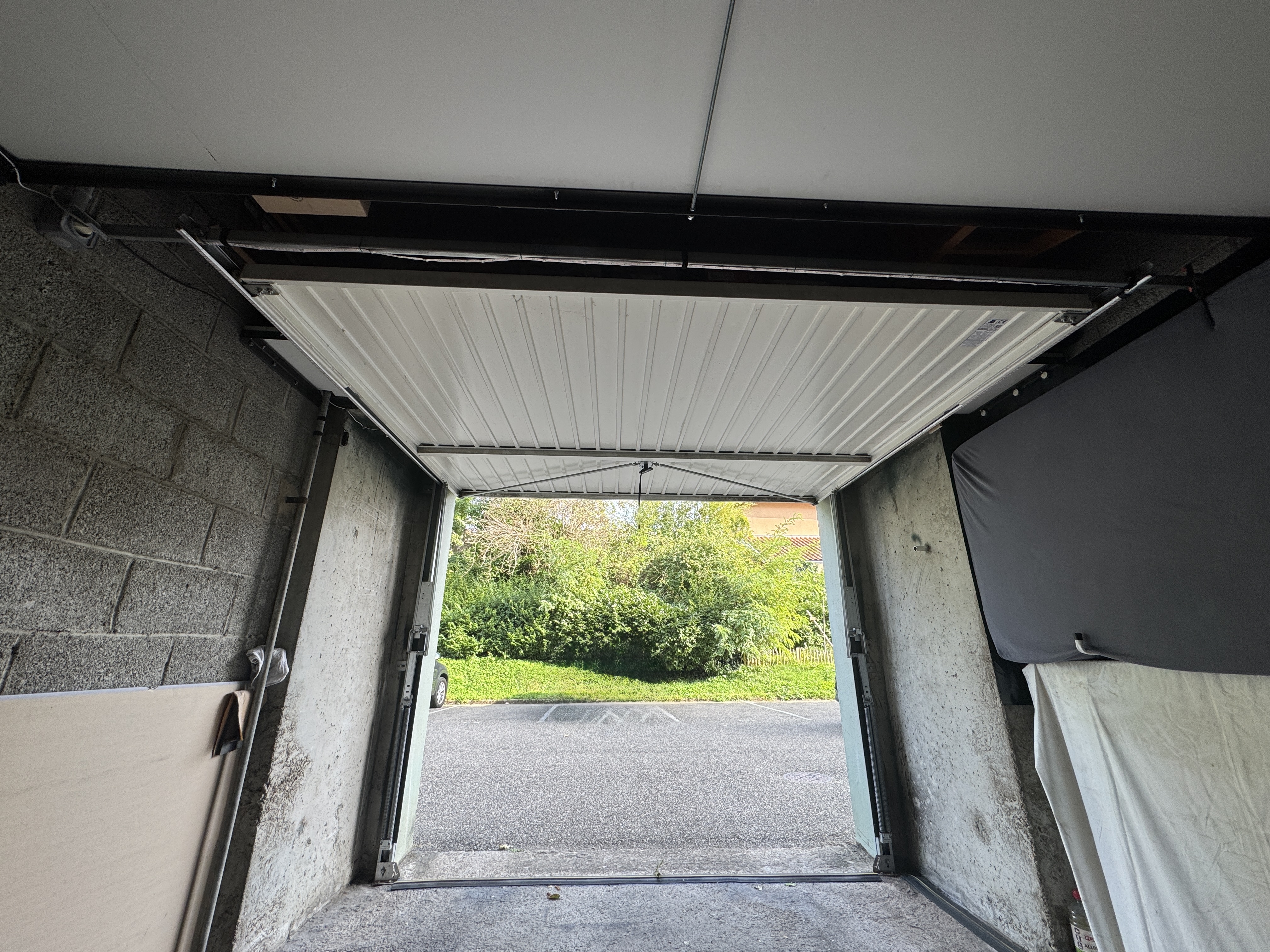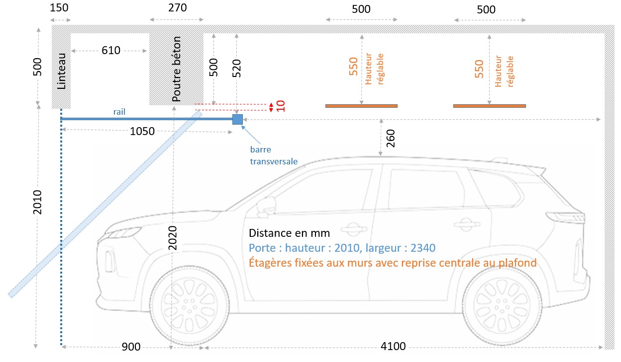 Lors de son ouverture, le haut de la porte passe à 1 cm d'une poutre en béton, ce qui nécessiterait de décaler l'installation du rail de 90 cm par rapport à la porte.