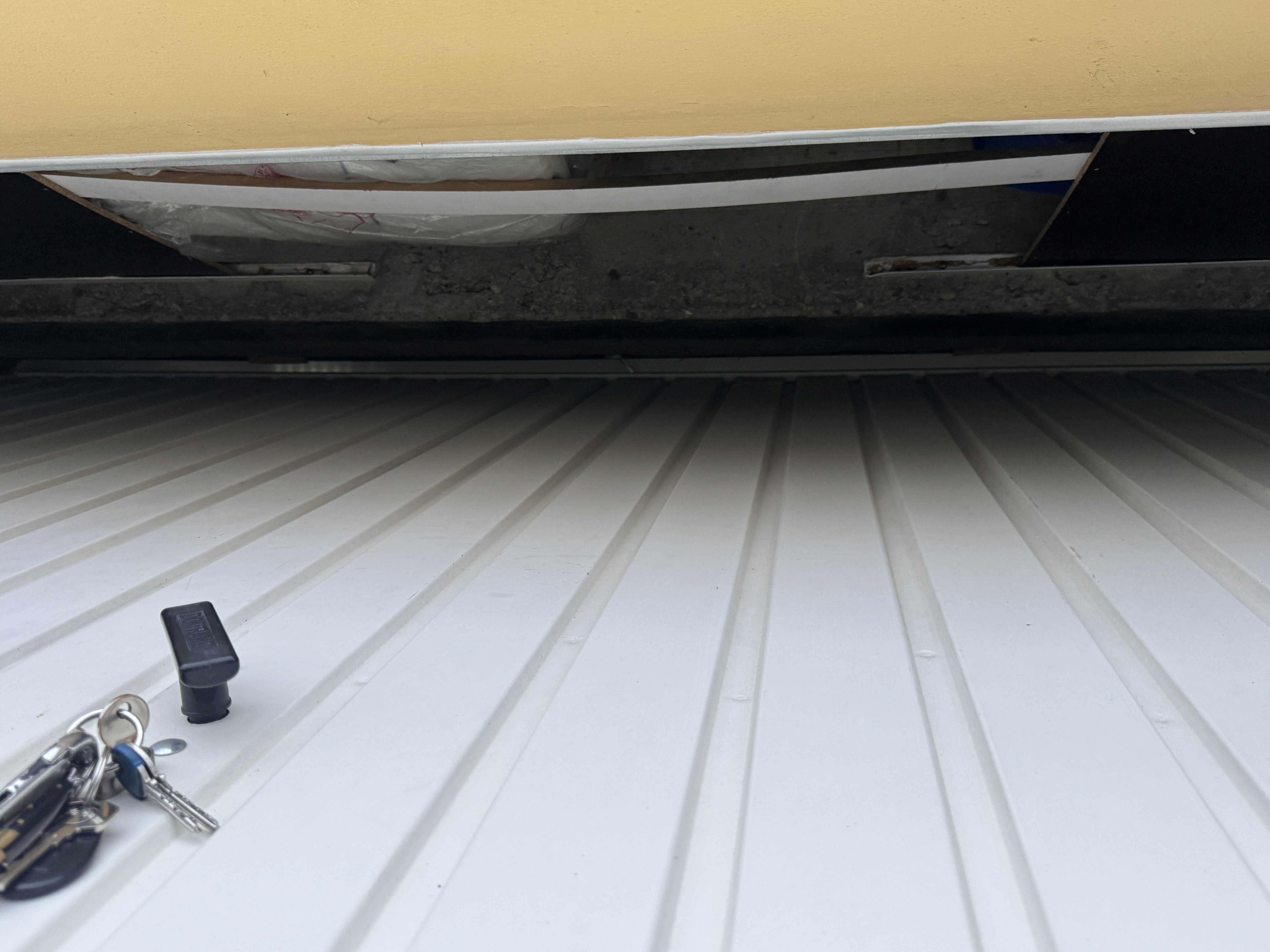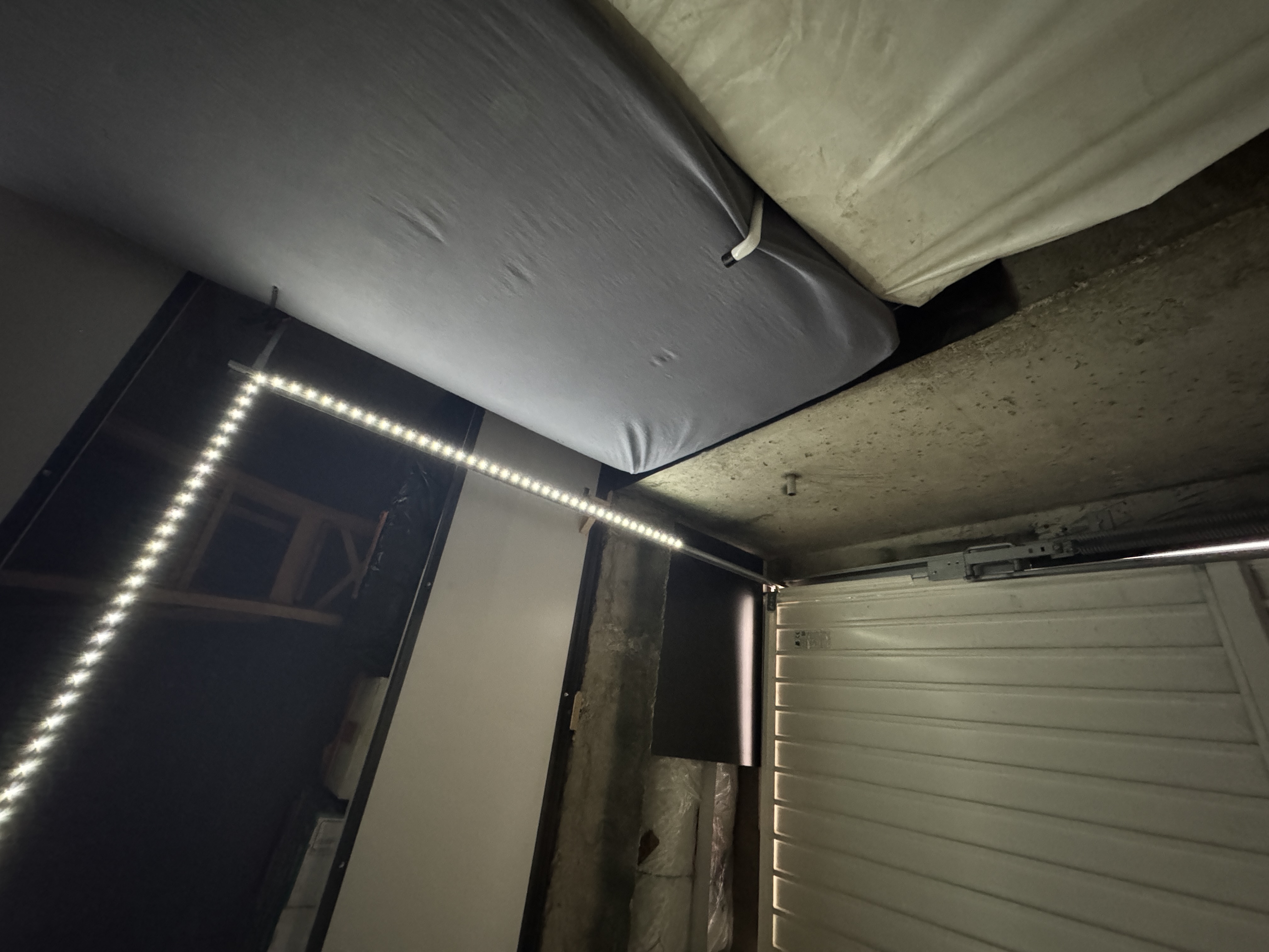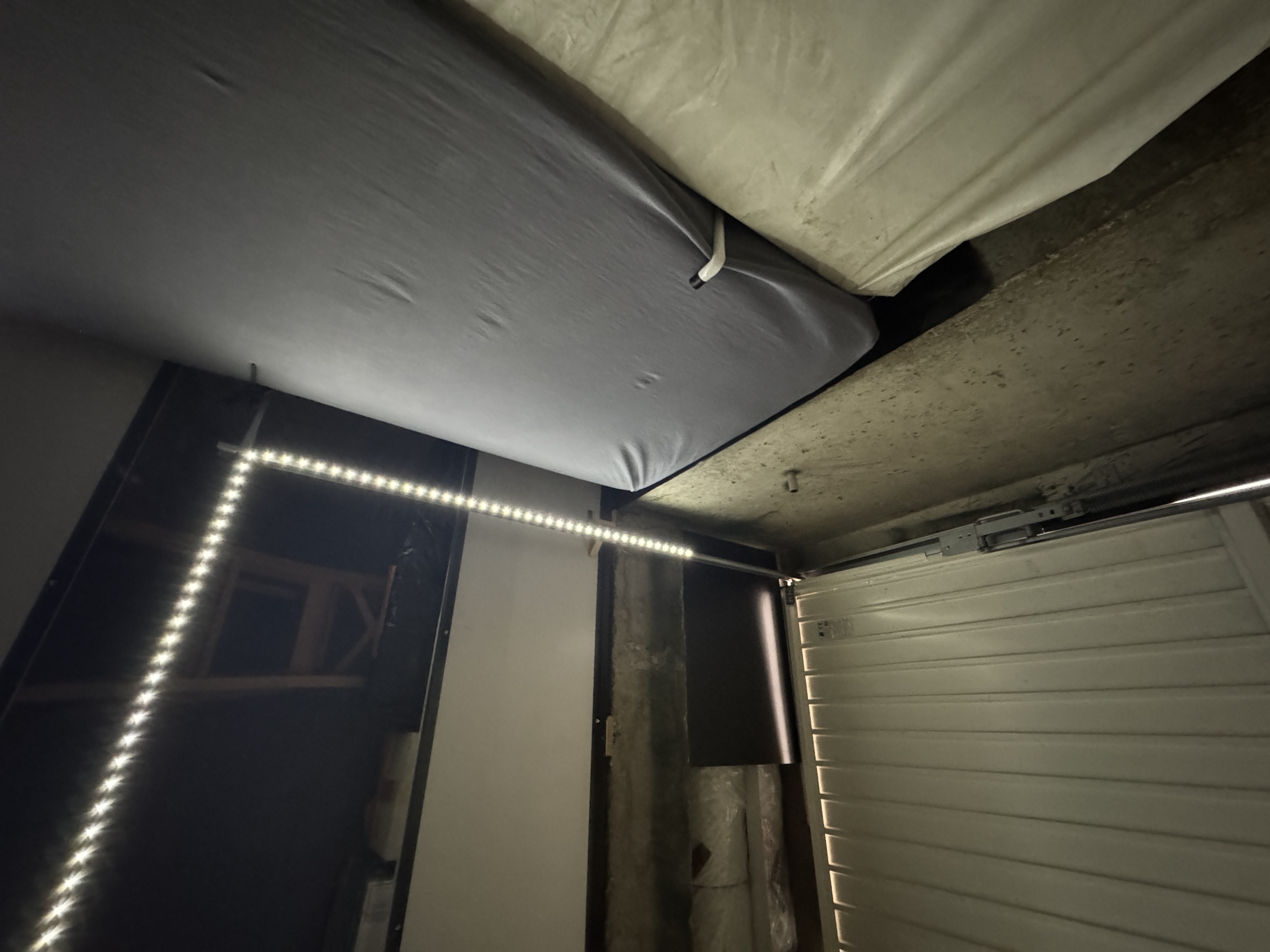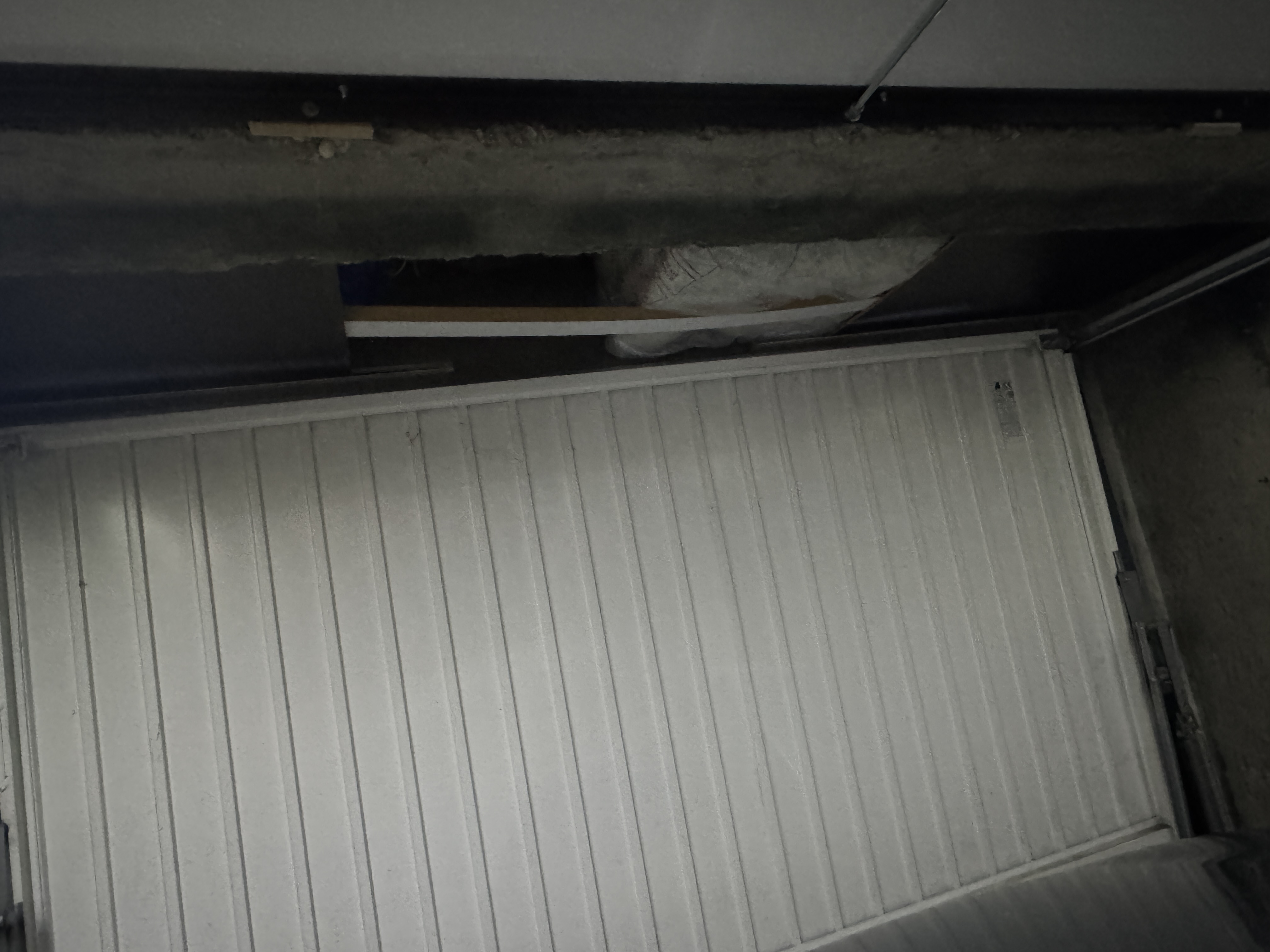 Lors de son ouverture, le haut de la porte passe à 1 cm d'une poutre en béton, ce qui nécessiterait de décaler l'installation du rail de 90 cm par rapport à la porte.