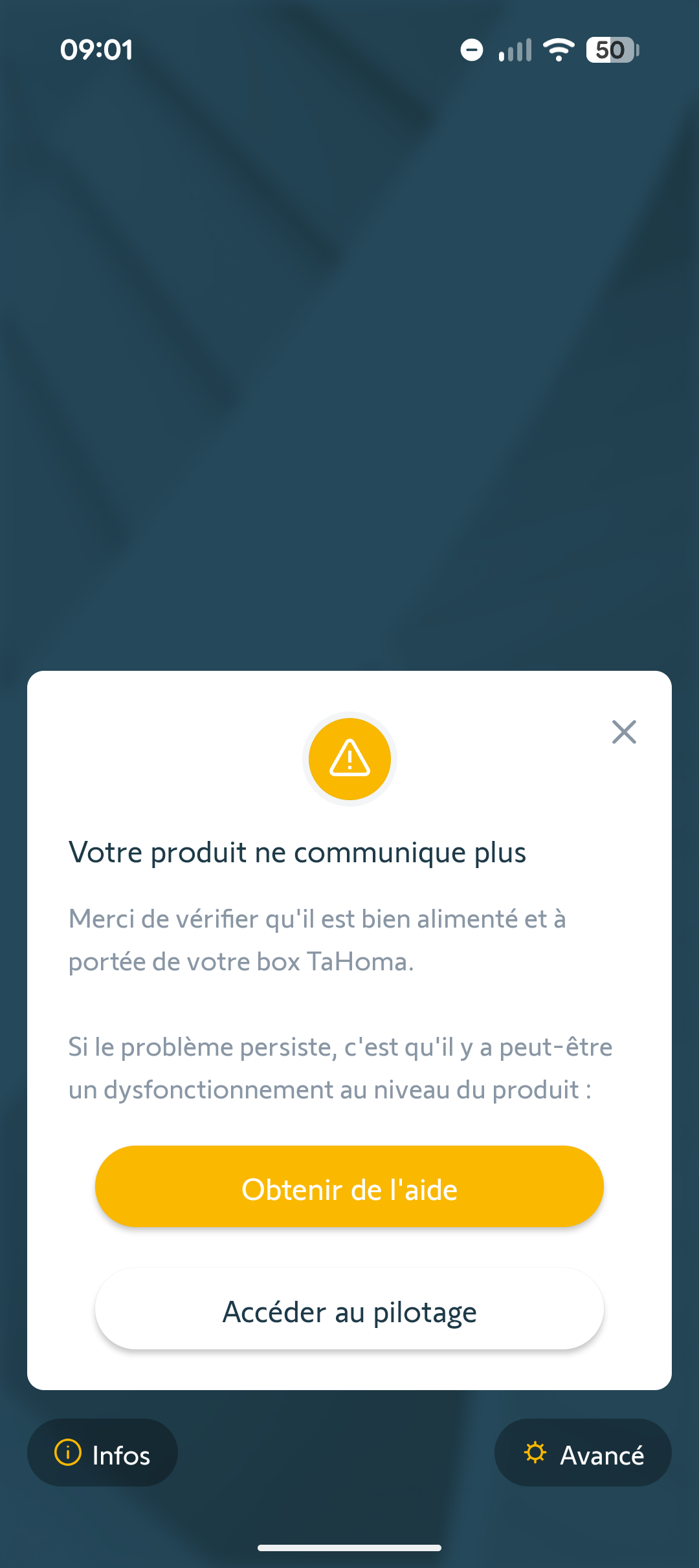Un de mes volets solaires Somfy Io ne fonctionne plus. Ni avec la télécommande, ni avec l'application. L'application m'indique : erreur de communication, votre produit ne communique plus.