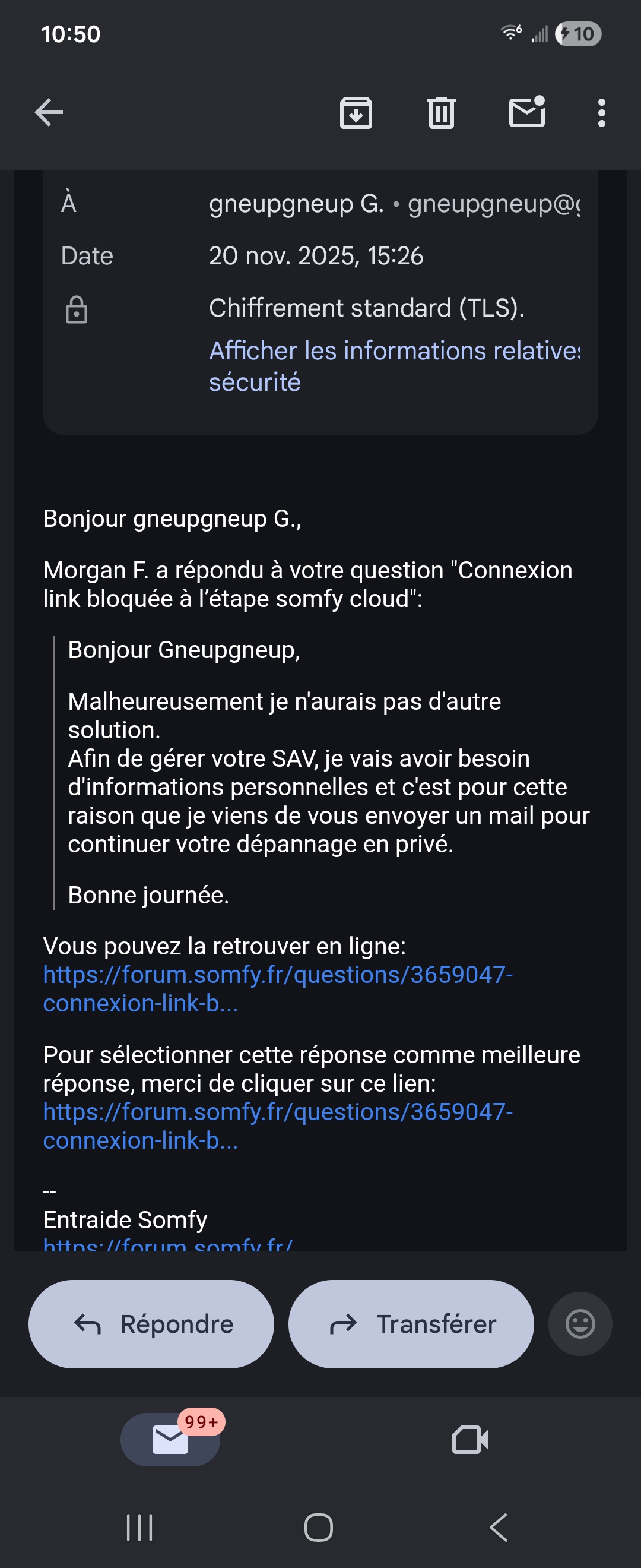 Meme problème de mon côté. J'essaie d'installer mon LInk. L'installation est systématiquement bloquée à l'étape de connexion au Cloud Somfy. J'ai modifié les paramètres de ma Freebox tel qu'indiqué dans votre tuto, fait un reboot de ma Freebox, essayé sur 4 téléphones Androïd différents, essayé sur un partage de connexion de téléphone... La procédure est systématiquement bloquée à l'étape de connexion au cloud somfy.