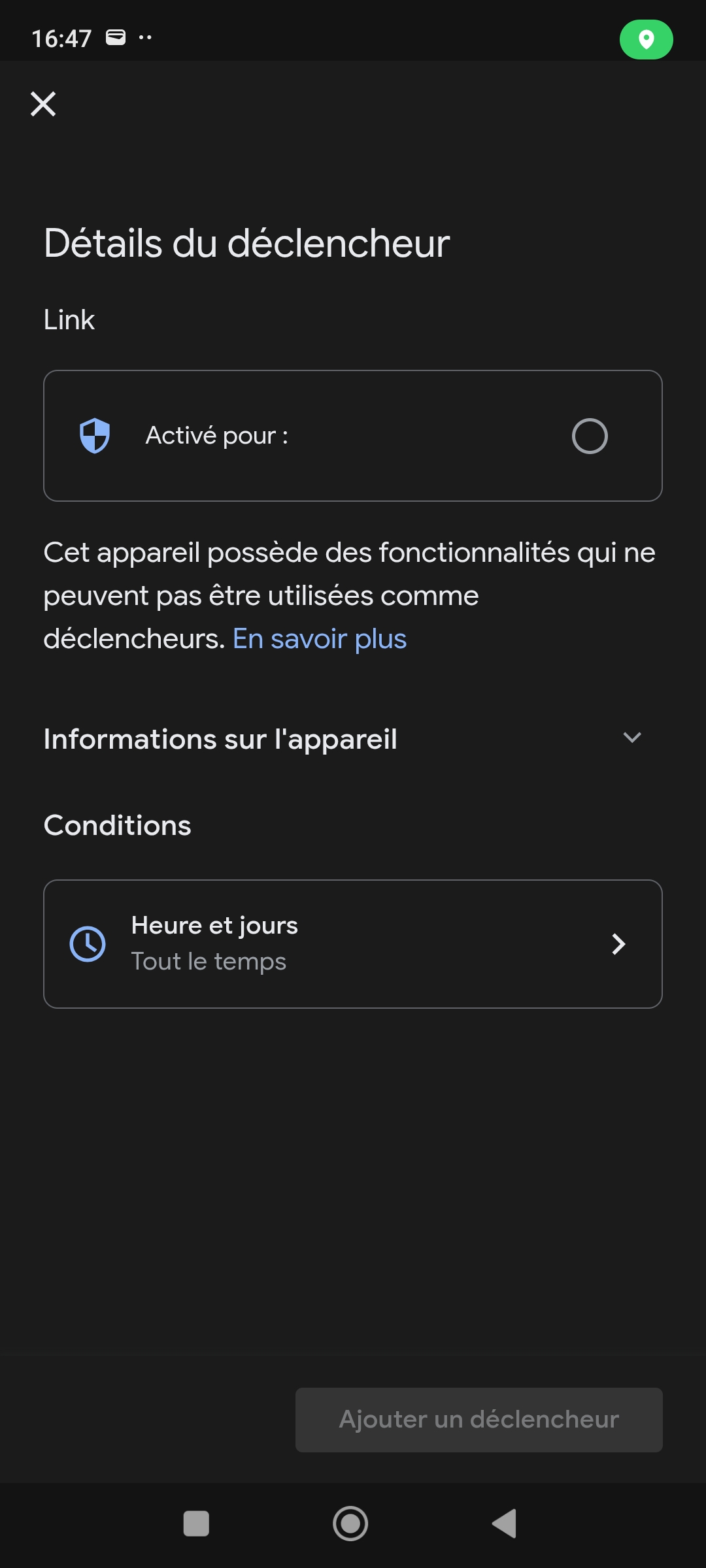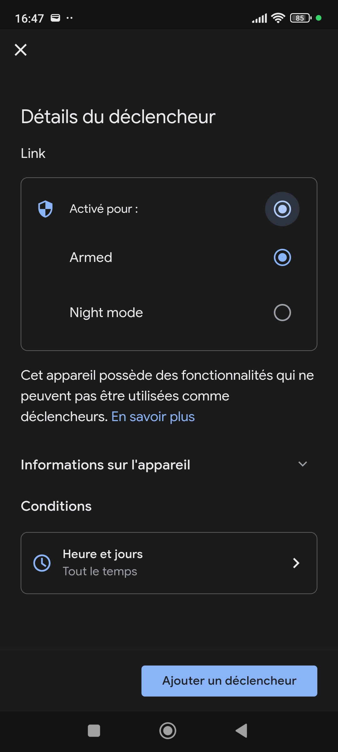 Je ne trouve plus le déclencheur "alarme désarmée" dans les routines google home.