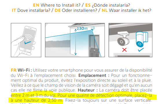 Par contre vous l'avez placé le plus haut possible. La détection ne va pas marcher. Par rapport au sol la caméra doit être placé entre 2m et 3m et il faut être a 2.50 pour avoir la détection la plus fiable.