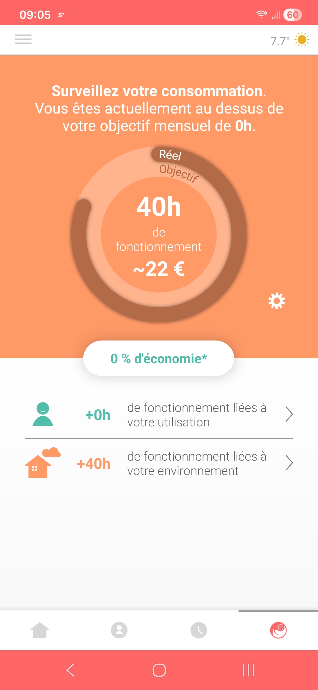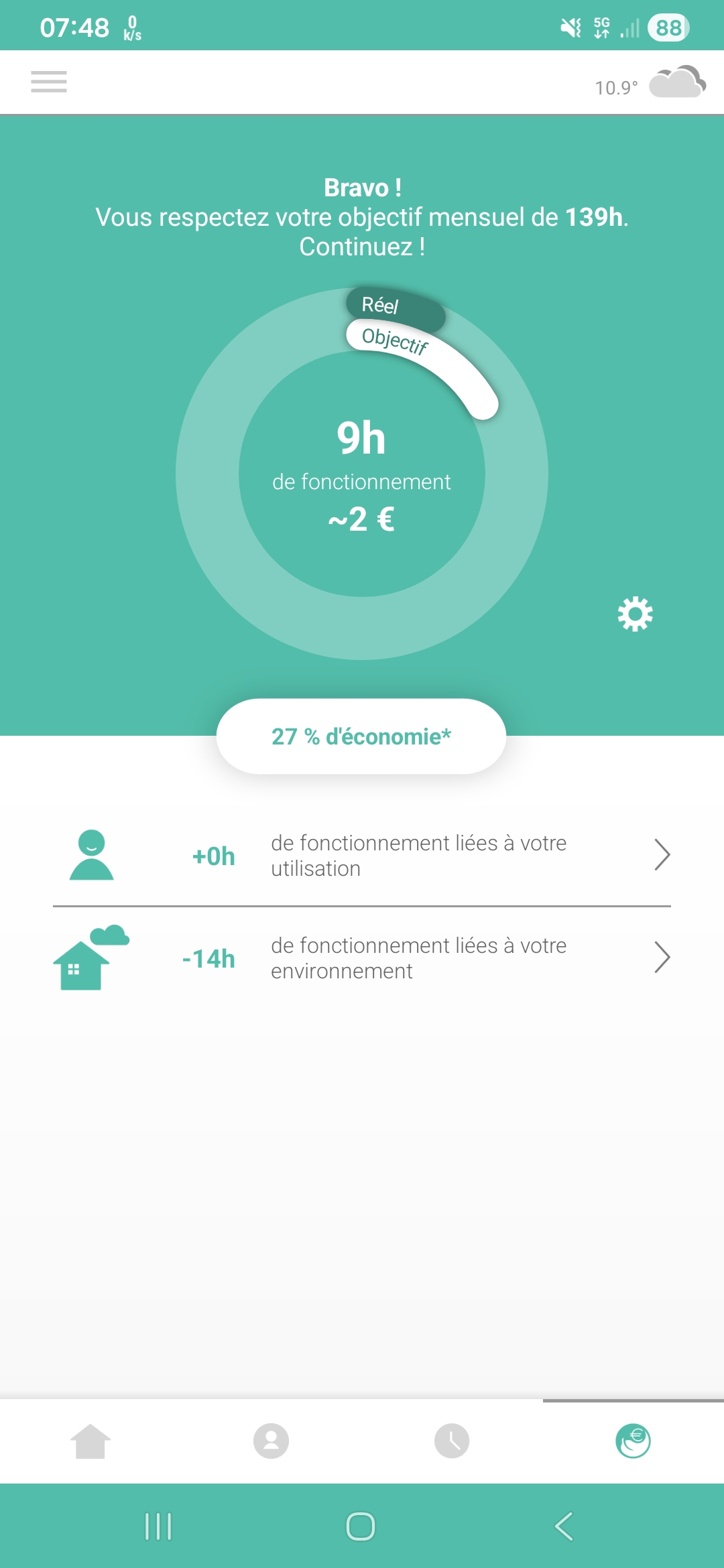 De mon côté, depuis mon application thermostat connecté Somfy, j’ai bien l’objectif de consommation de fonctionnel, Avez-vous bien défini dans l’application, « paramètres coaching » (roue denté à droite du graph), votre installation qui permet à l’application de définir un objectif ?