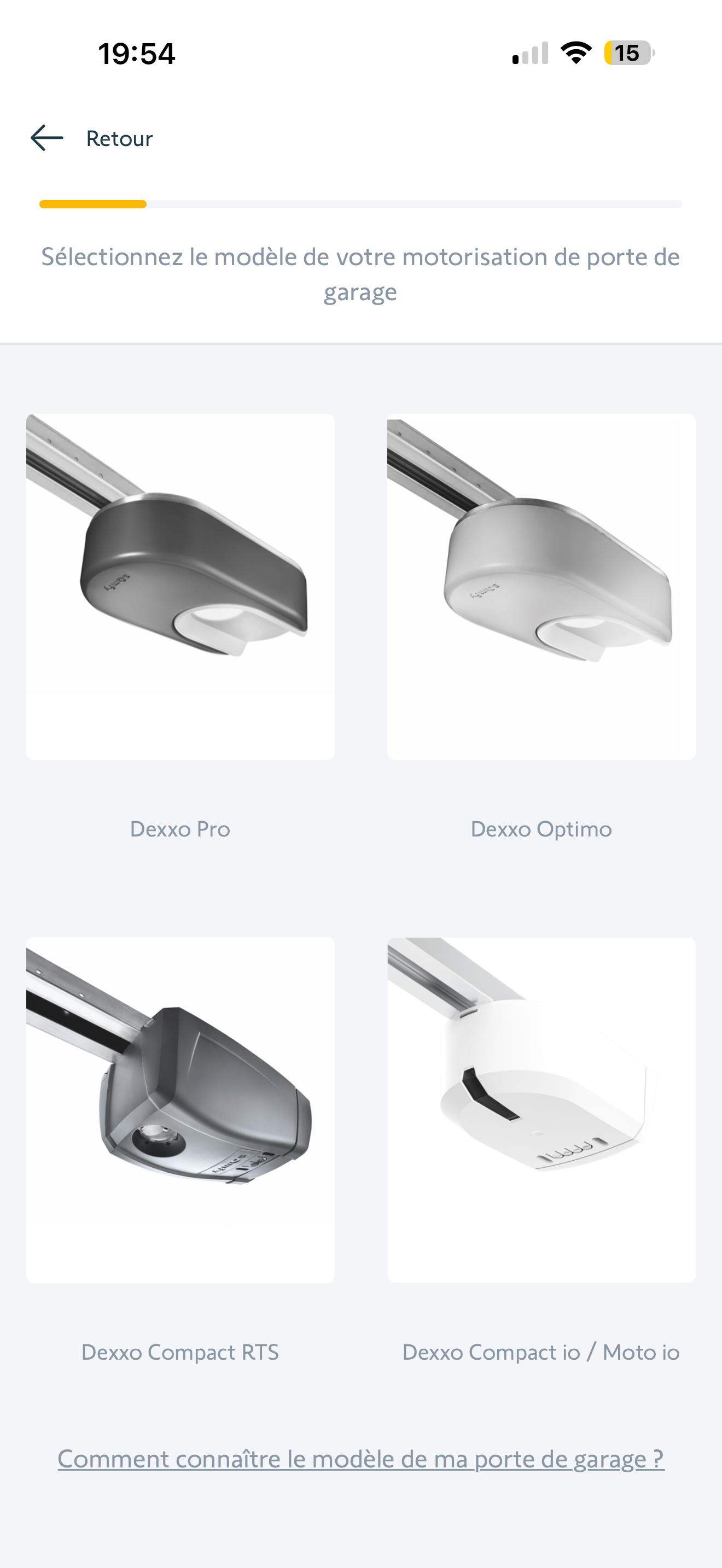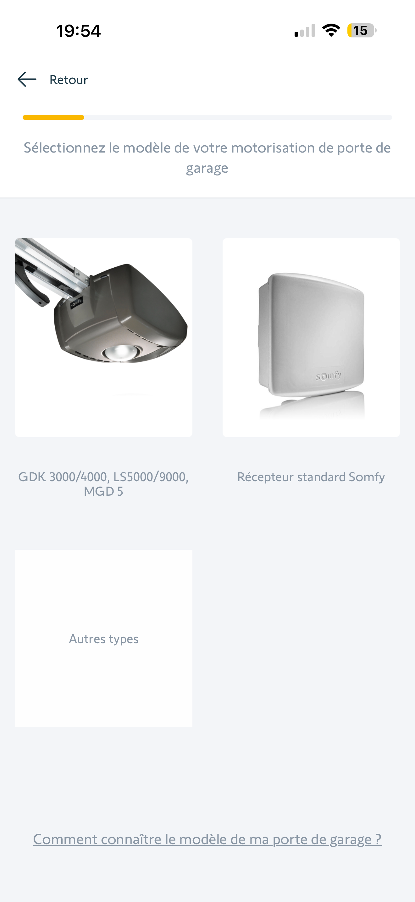 Iprahim P: Vous venez de lever un point qui peut avoir son importance... Pour ma part, je n'ai pas " Récepteur standard Somfy" Lorsque je clique sur "porte de garage verticale" l'appli propose plusieurs moteurs et "autres types" mais dans "autres types" il propose juste d'appuyer 3 sec sur le bouton "Prog". C'est bien ça? ou vous avez vraiment "Récepteur Standard Somfy"?