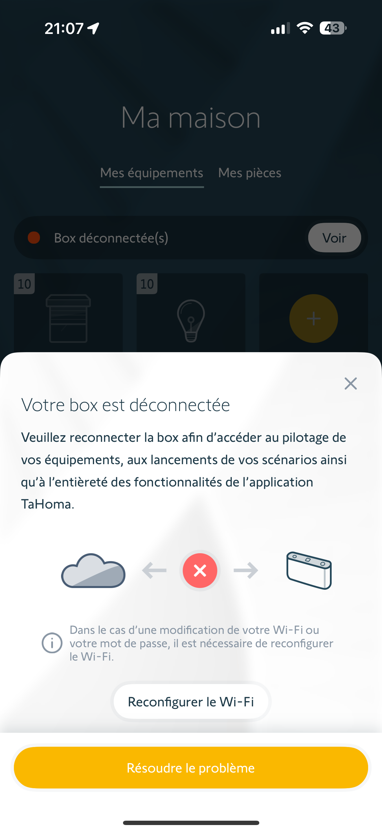 Lorsque j’essaie de la reconnecter via l’application TaHoma, il m’est impossible de la connecter au Wi-Fi. J’ai pourtant vérifié que mon réseau est bien en 2,4 GHz.