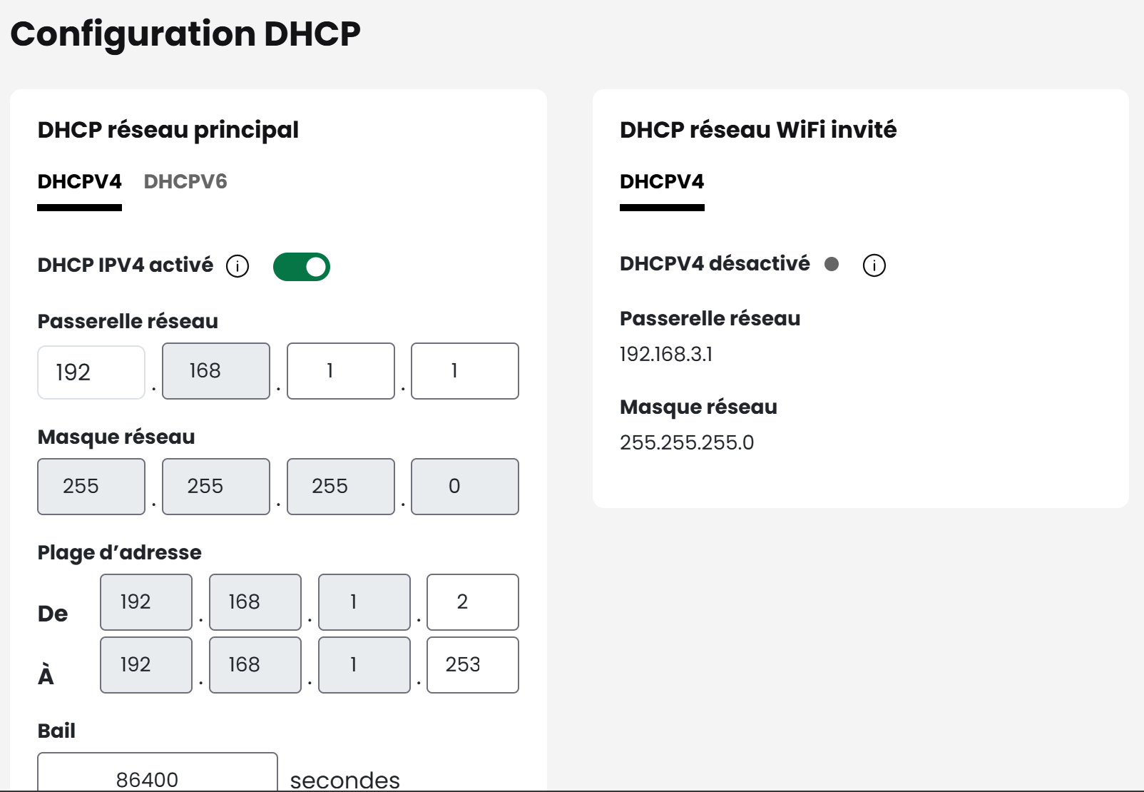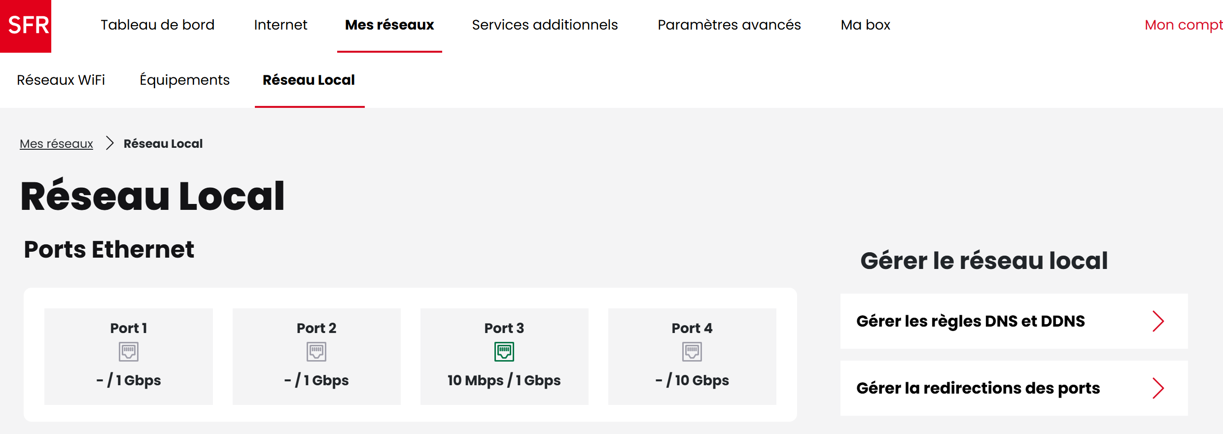 ci dessous 2 prints screen de l'acceuil de la nouvelle box qui a priori est en IPV4Full . je suis perdu , ou dois je aller ? dans le configurateur DHCP ? car dans le autres pas de Ports reglable et doi-je changer la plage des adresses IP dispo la mienne est a priori en 192.168.0 ET La plage du DHCP est 192.168.1 ... un grand merci d'avance .