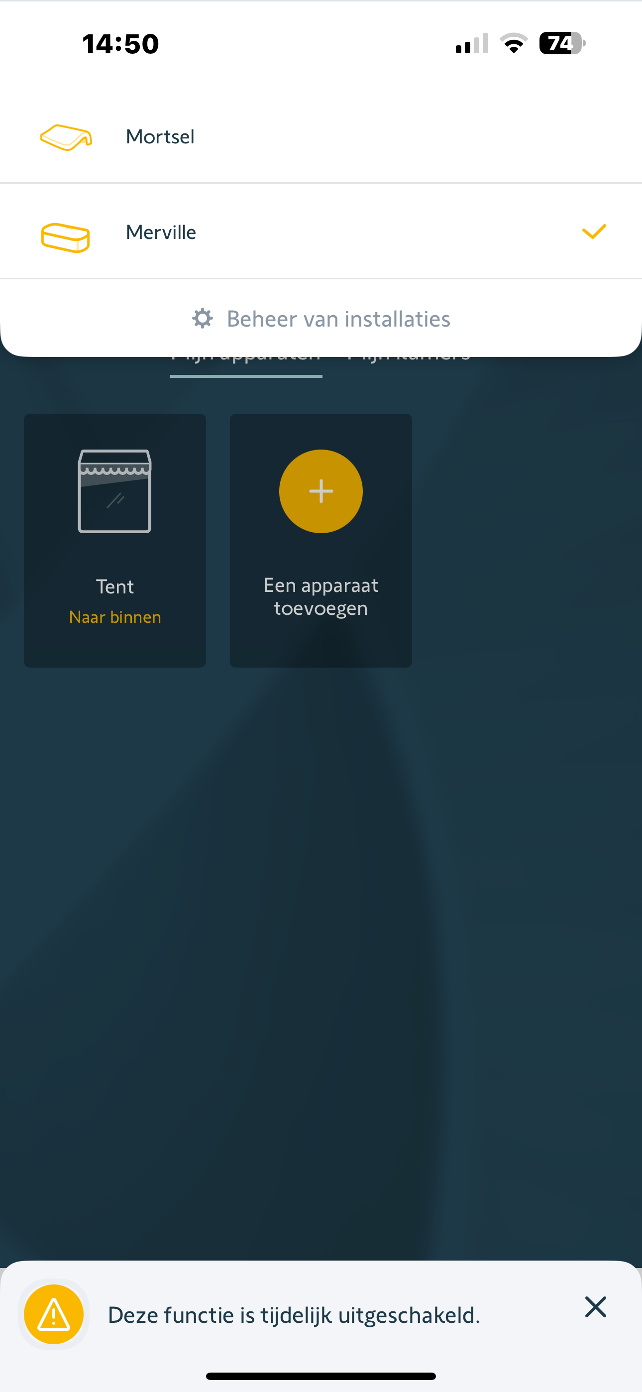 pour l'installation en Belgique je ne peux plus arriver à ce point. Voir 2 anexes: Cliquer sur "gestion des installations"me donne erreur: "Cette fonctionnalité est temporairement désactivée.". L'autre image montre la page pour l'installation en France: pas de bouton déconnection.