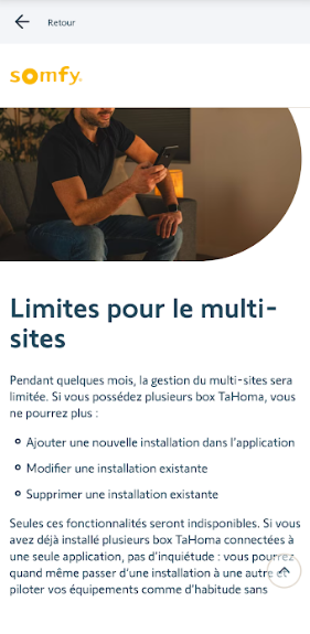Comme vous avez indiqué dans votre message "Le multi site est désactivé et en cours de remaniement. Il sera de nouveau disponible courant 2026". Ainsi plus de possibilité d'avoir 2 installations. Sans la moindre notification de Somfy...