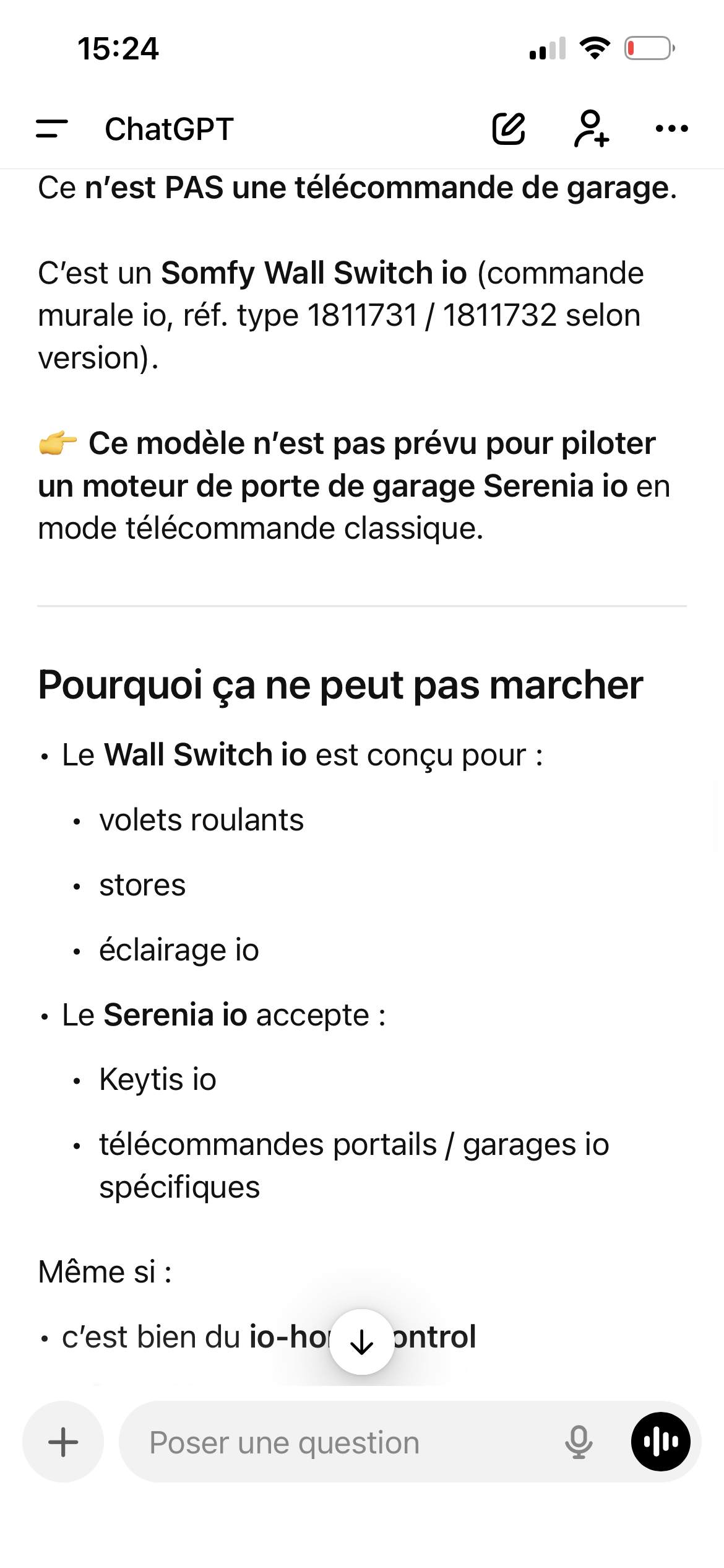 J’ai acheté un kit :le moteur serenia 1100 avec un kit de connectivité, 2 télécommandes et une télécommande murale ( le wall switch 3 ch io ) et ces ce dernier que je n arrive pas à appairer au moteur serenia. Les 2 télécommandes fonctionnent bien le kit de connectivité aussi mais pas le wall switch. D après ChatGPT il n est pas compatible j ai du mal a y croire ci joint les photos.