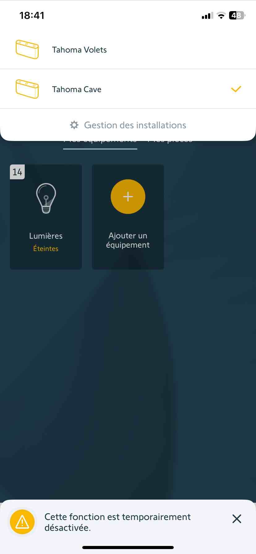 seulement sur mon téléphone, je n'arrive plus du tout à commander la Tahoma Volets uniquement la Tahoma Cave, mais sur le téléphone de mon épouse qui n'a que la Tahoma Volets cela fonctionne bien seulement je dois par moment me reconnecté et c'est repartis, mais sur mon téléphone rien pour la Tahoma Volets il n'y a que la Tahoma Cave qui répond, sur les deux téléphones il n'y a plus le bouton déconnection, le bouton jaune réessayer ainsi que les boutons gestions ne fonctionnent pas. Je vous fais suivre quelques photos.