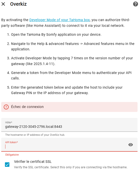 Je n'arrive pas a intégrer mon somfy connectivity kit avec overkiz