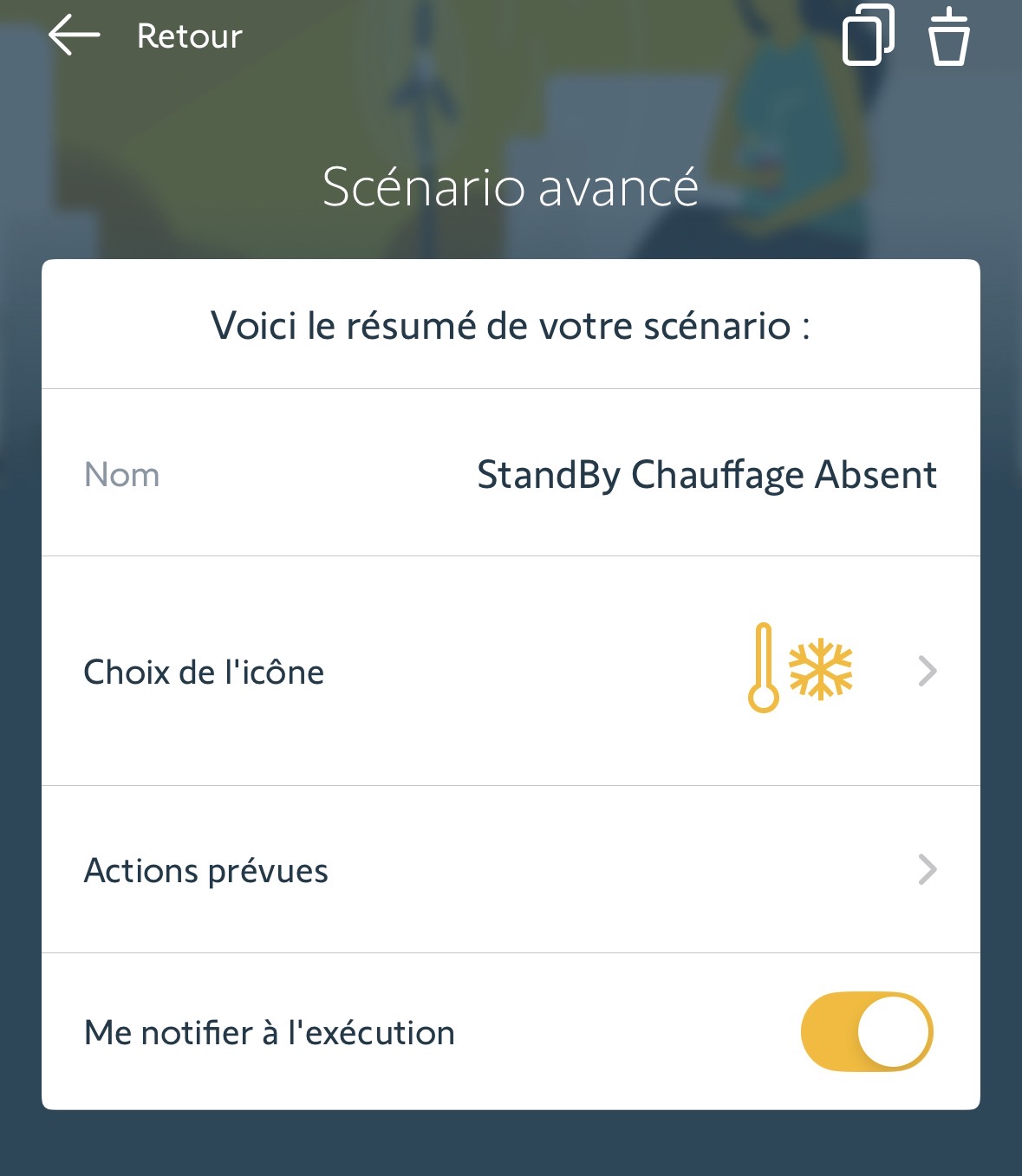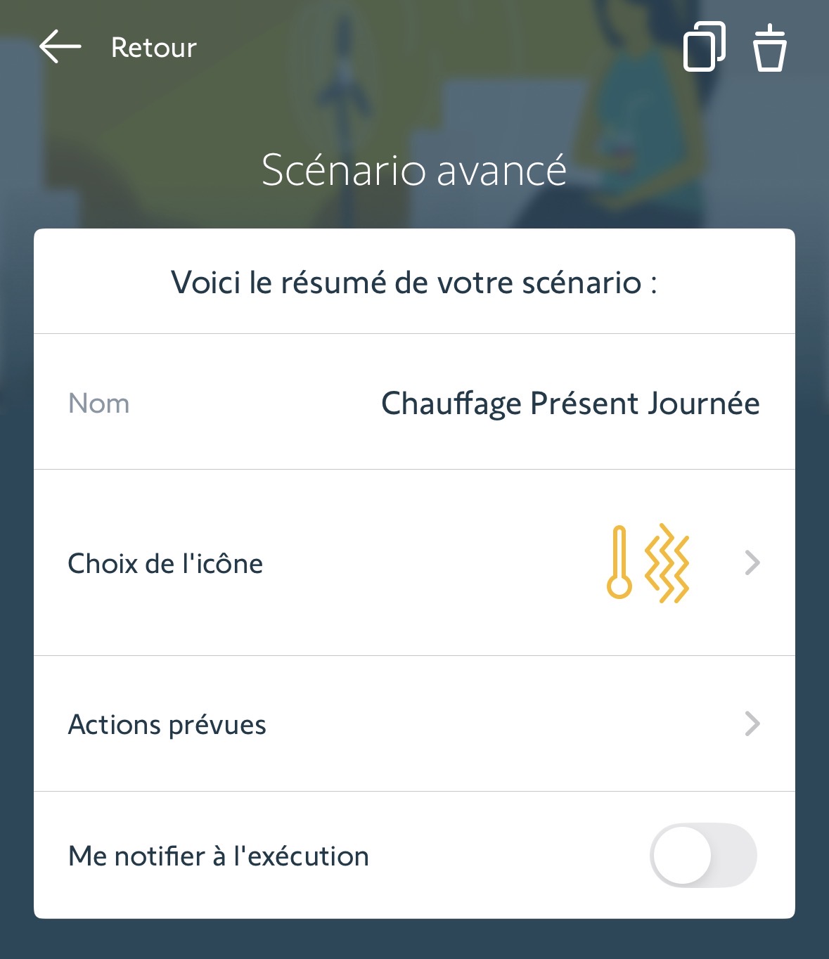 2) PRÉSENT JOURNÉE : Scénario planifié à partir de 7h tout les jours -> Chauffage en mode "A la maison"