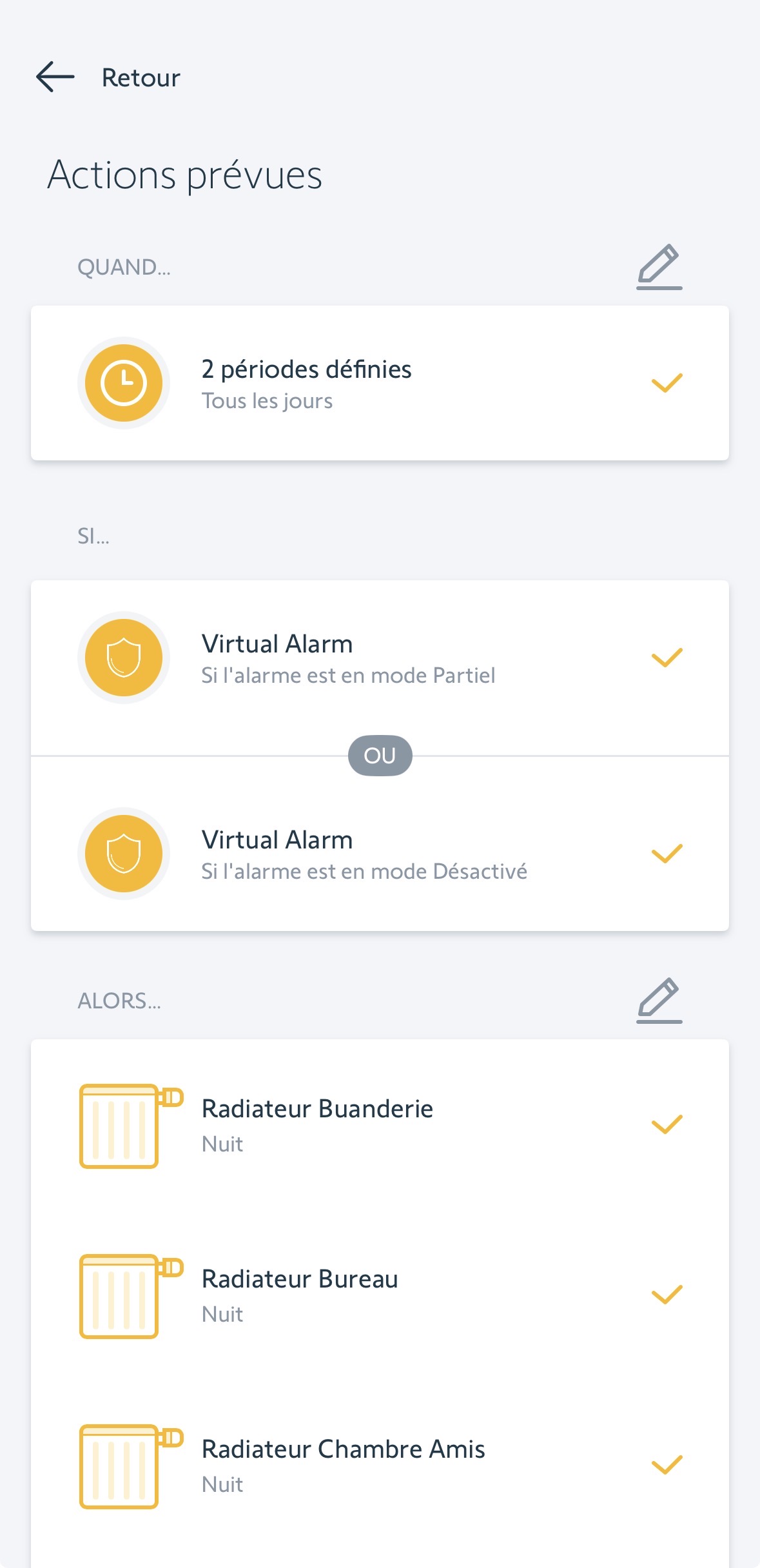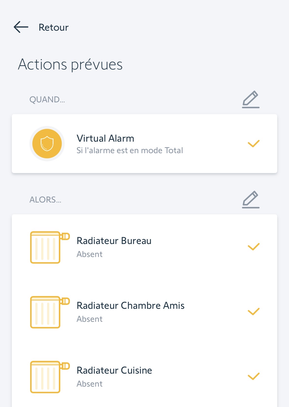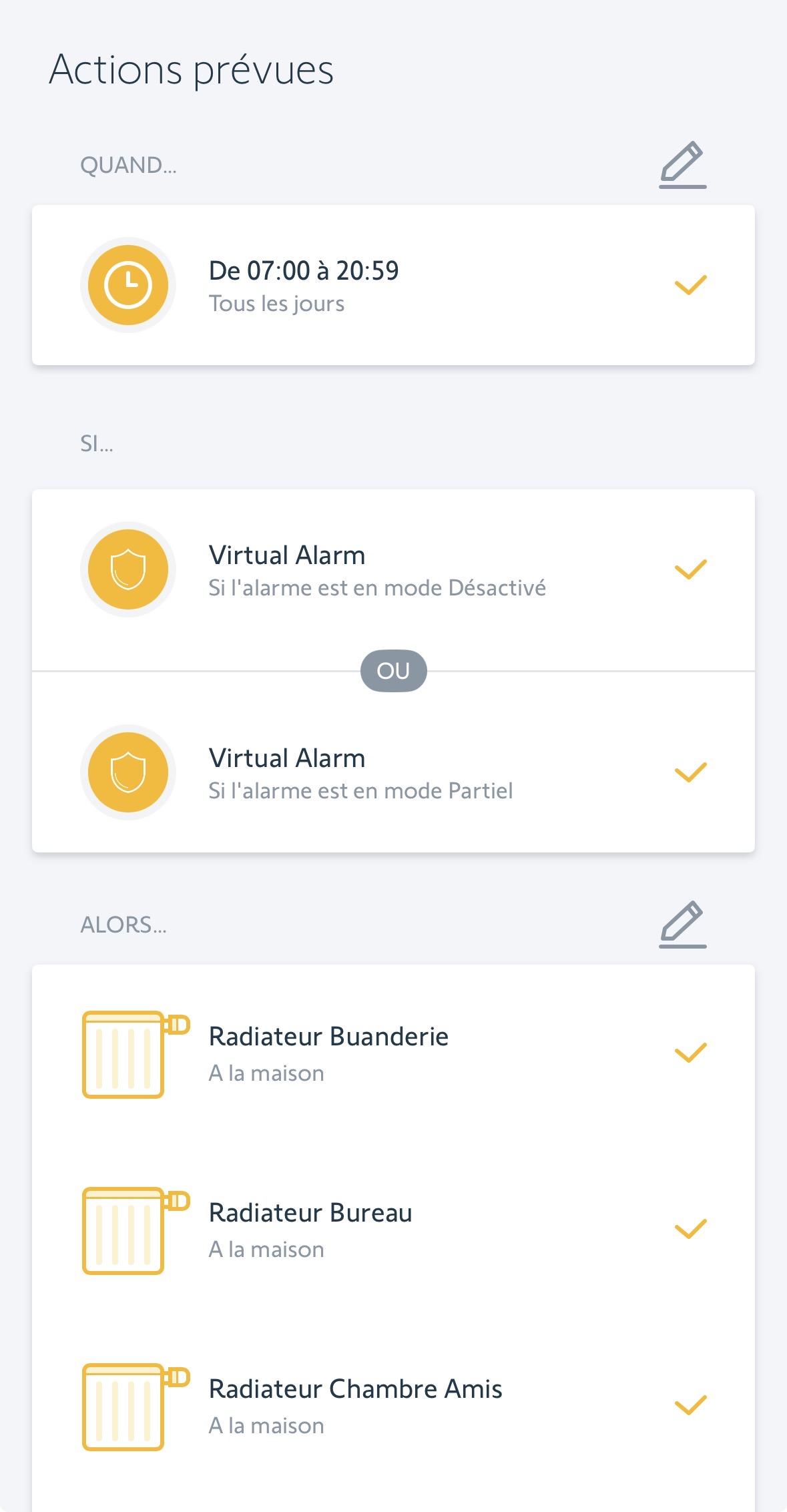 Dans vos premiers scénarios, les modes de chauffage, ne se faisant qu’avec des scénarios planifiés, ils ne peuvent s’activé au changement d’état de l’alarme.
