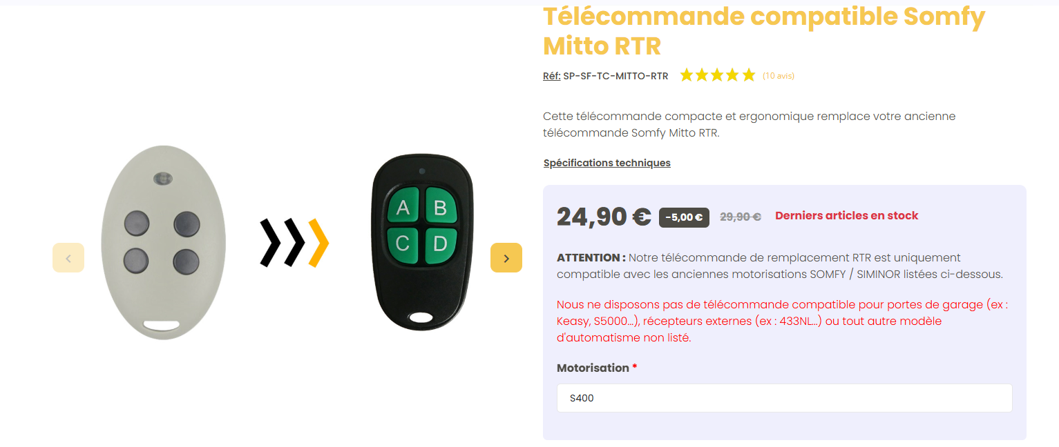 J'ai une motorisation S400 pour mon portail. Il fonctionnait avec une télécommande Mitto RTR mais je ne trouve plus cette télécommande à acheter. J'ai acheté une Keytis RTS 2 canaux qui était normalement compatible mais ça ne fonctionne pas même en faisant la manipulation spéciale.