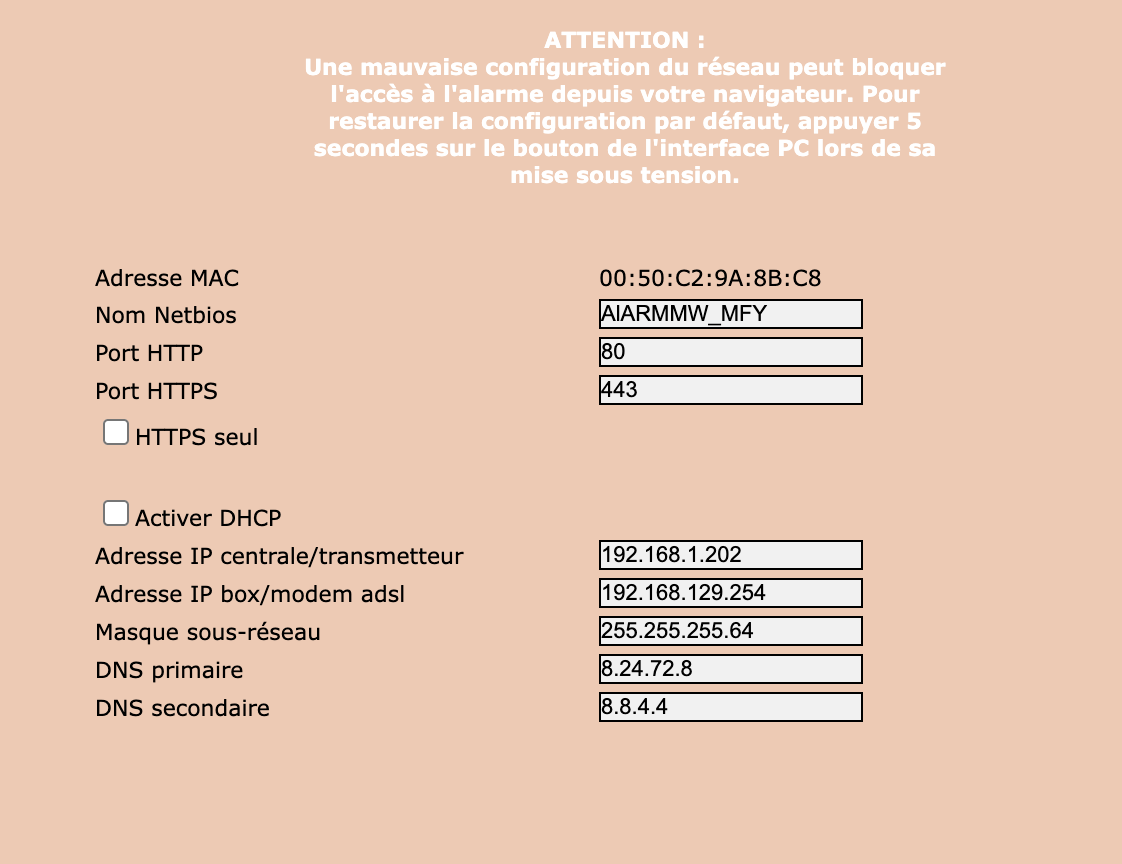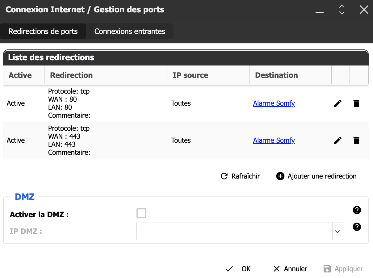 Vous trouverez en pièce jointe les configurations coté centrale et Box internet, ainsi que la confirmation que les ports 80 et 443 sont bien ouvert coté Box internet.