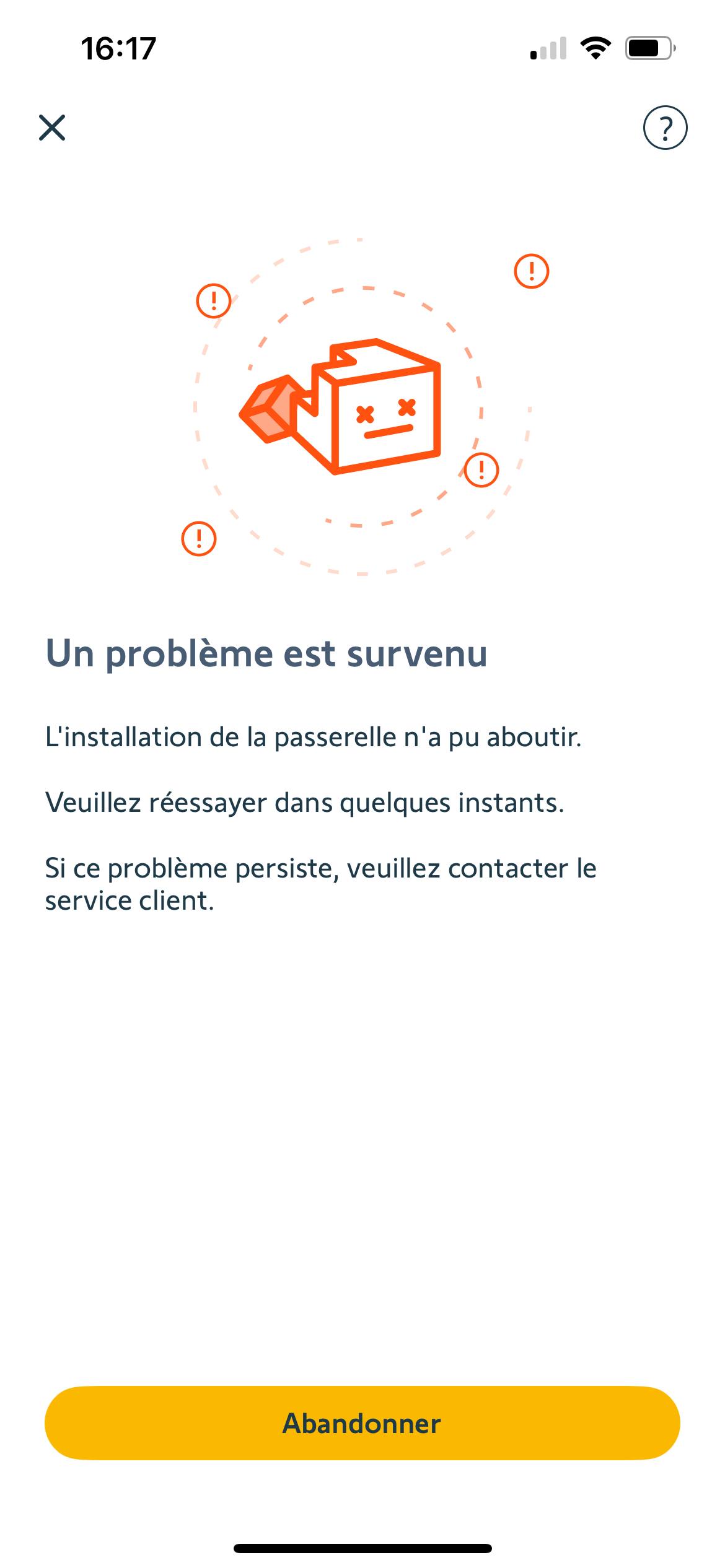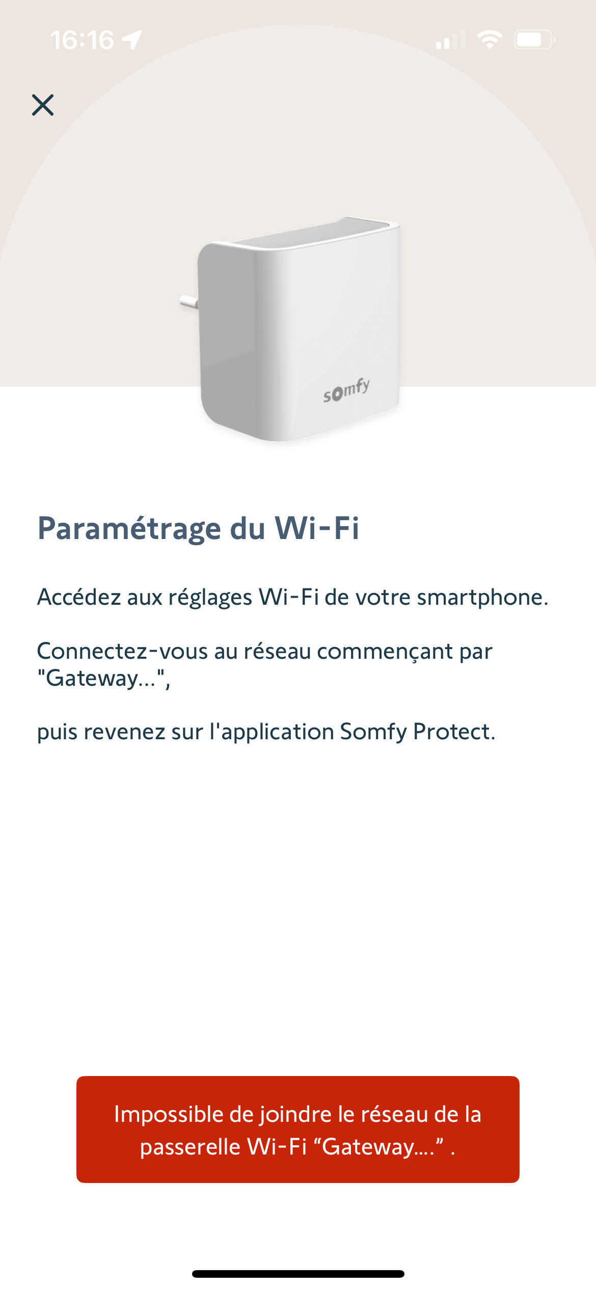 Mais je ne parviens pas à l'installer avec l'application Somfy Protect. La connexion à la passerelle échoue (cf message d'erreur joint).