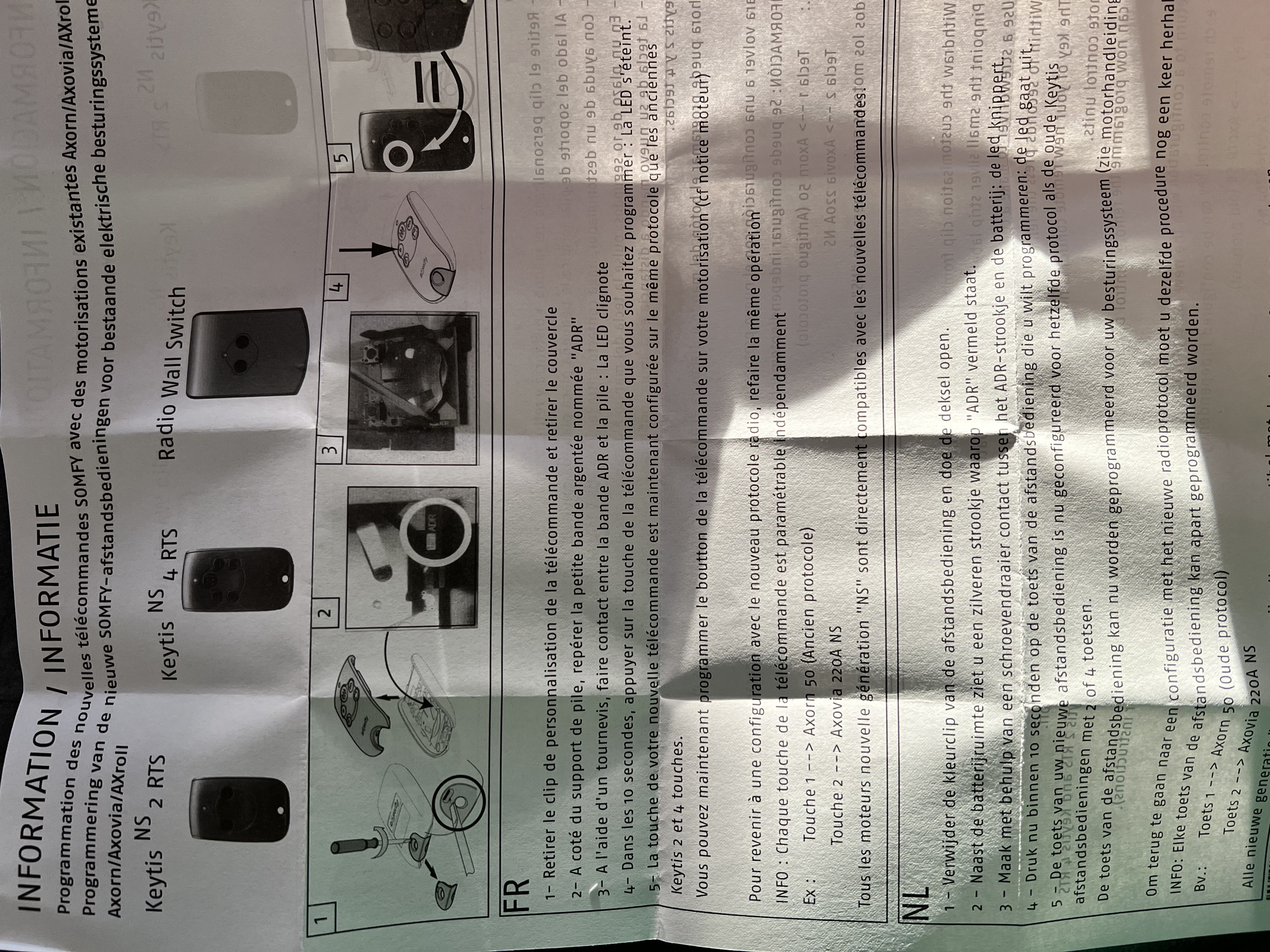 J'ai depuis peu une porte de Gge avec 2 télécommandes TR2. Je viens d'en recevoir une 3eme (Keytis nS2Nuevo) mais la notice de programmation accompagnant celle ci ne correspond pas au produit reçu. En effet dans la notice de programmation (photo) il est fait état d'une "bande argentée ADR" mais dans la télécommande reçue cette bande n'existe pas (photo).
