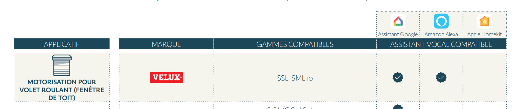 Côté Velux, je vois uniquement mentionné SSL-SML io (motorisation pour fenêtre de toit).