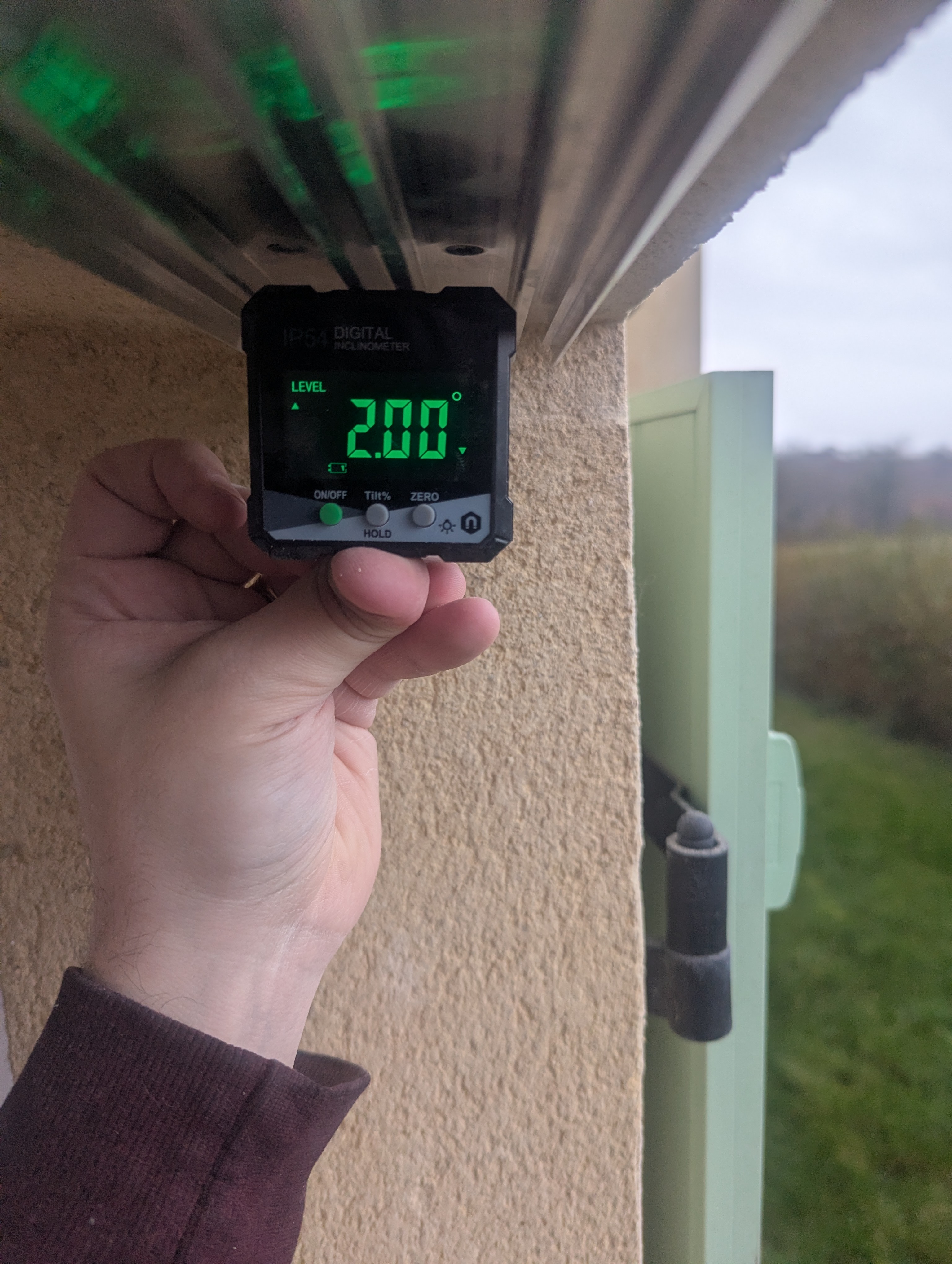 Le dessous de mon linteau est recouvert d'enduit de façade, et j'ai un angle d'environ 2° (au plus bas vers l'extérieur de la maison) quand je positionne le châssis.