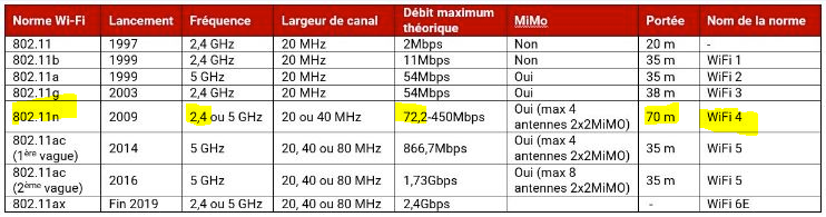 Ci joint le tableau des normes wifi avec leurs vitesses maximum respective.