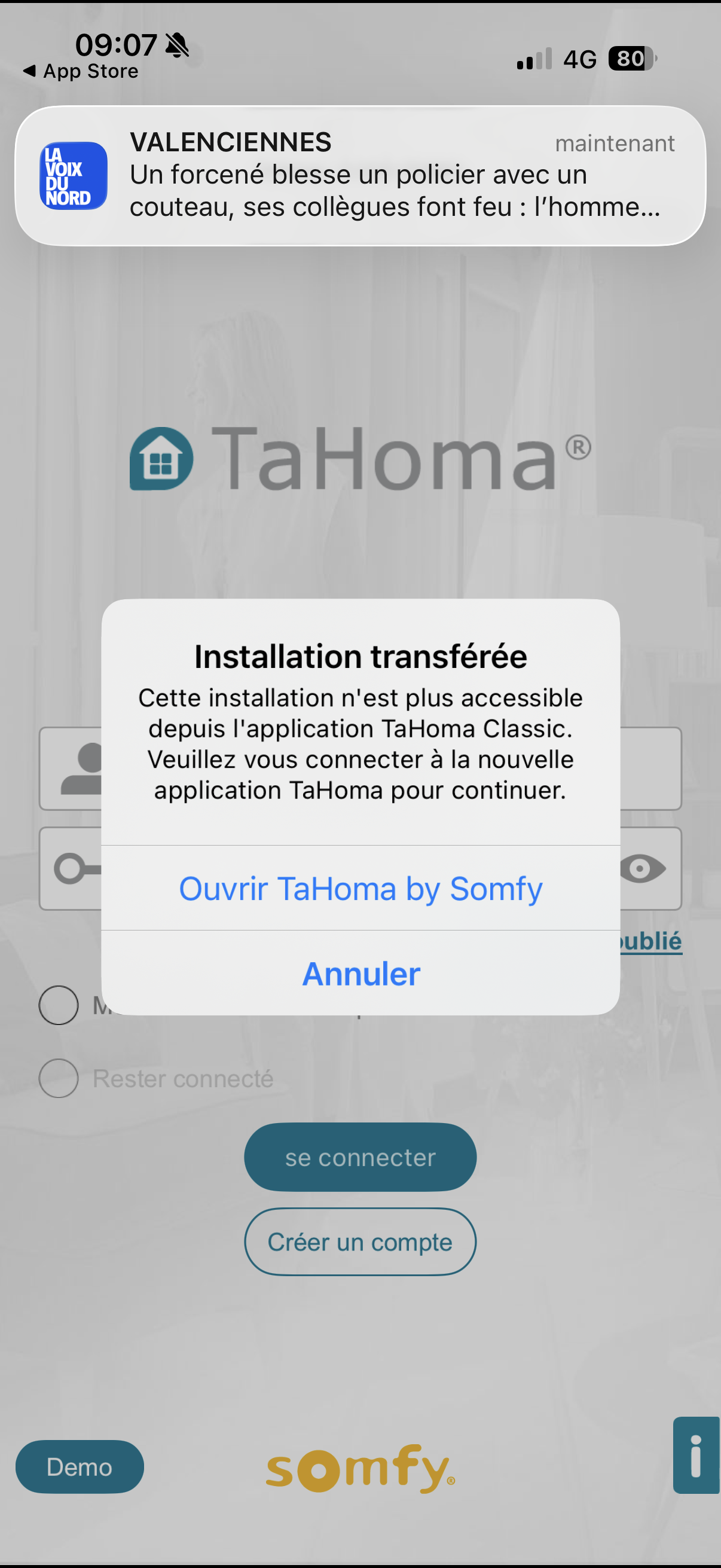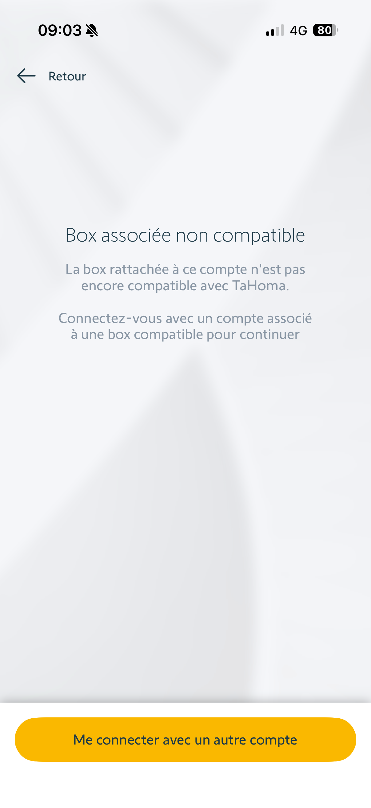 Depuis quelques jours je n’ai plus accès à mon installation Dominique sur l’application TaHoma. J’ai un message d’erreur me signifiant que ma box n’est pas compatible.