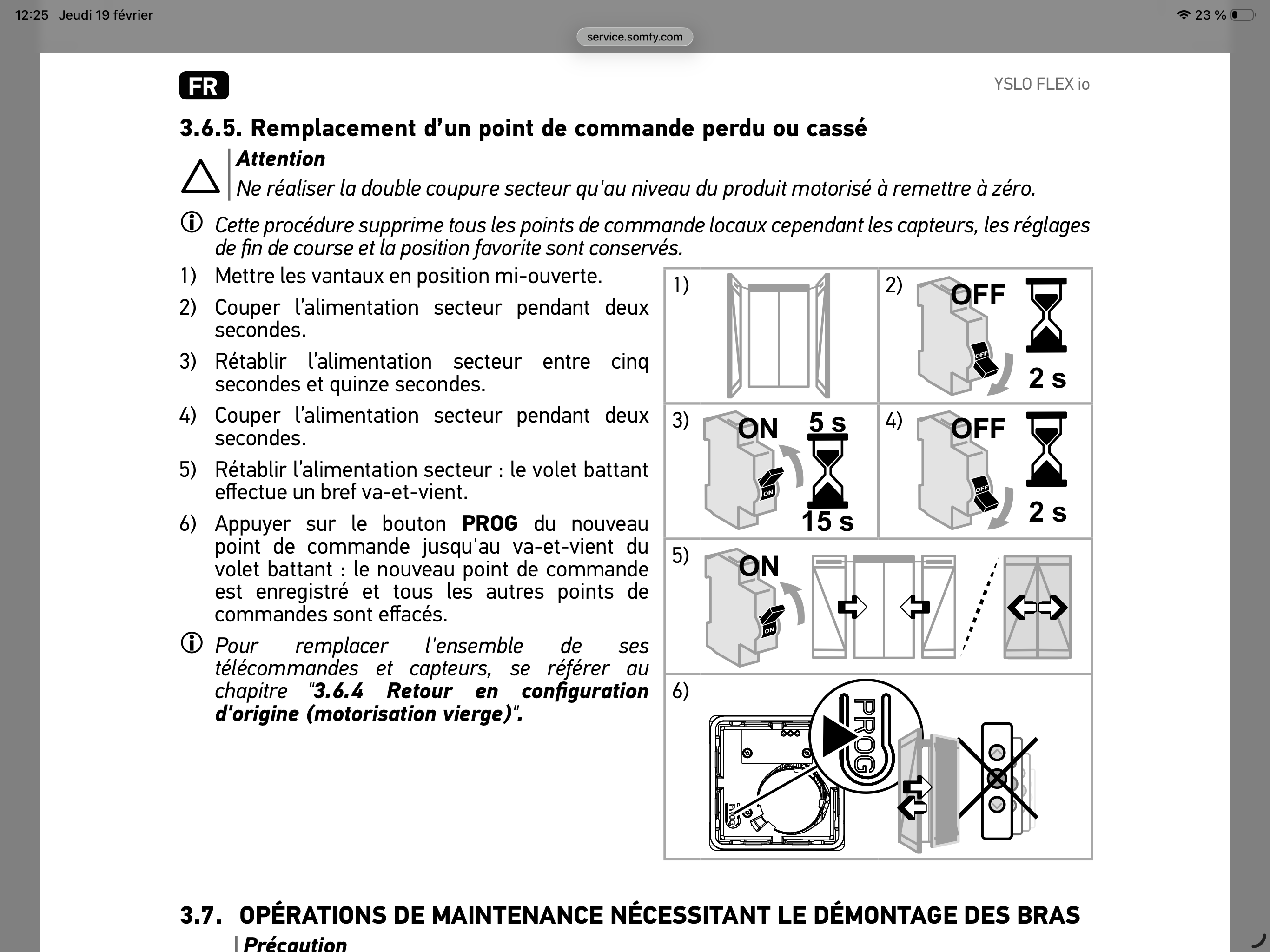 Mes volets sont pilotés principalement par ma box et très rarement par les boutons, j’ai constaté tardivement, que les piles des boutons smoove étaient à remplacer, et maintenant j'ai un bouton qui n’est plus appairé à son volet. J’ai suivi la procédure que j’ai trouvée sur votre site « Remplacement d'un point de commande perdu ou cassé » mais quand je réalise la double coupure, mon volet ne bouge pas comme indiqué dans la procédure, par contre si j’appuie sur le bouton PROG le volet fait bien un va et vient, mais le bouton n’est pas appairé pour autant. Pour info, ce volet est toujours fonctionnel via ma box TaHoma.
