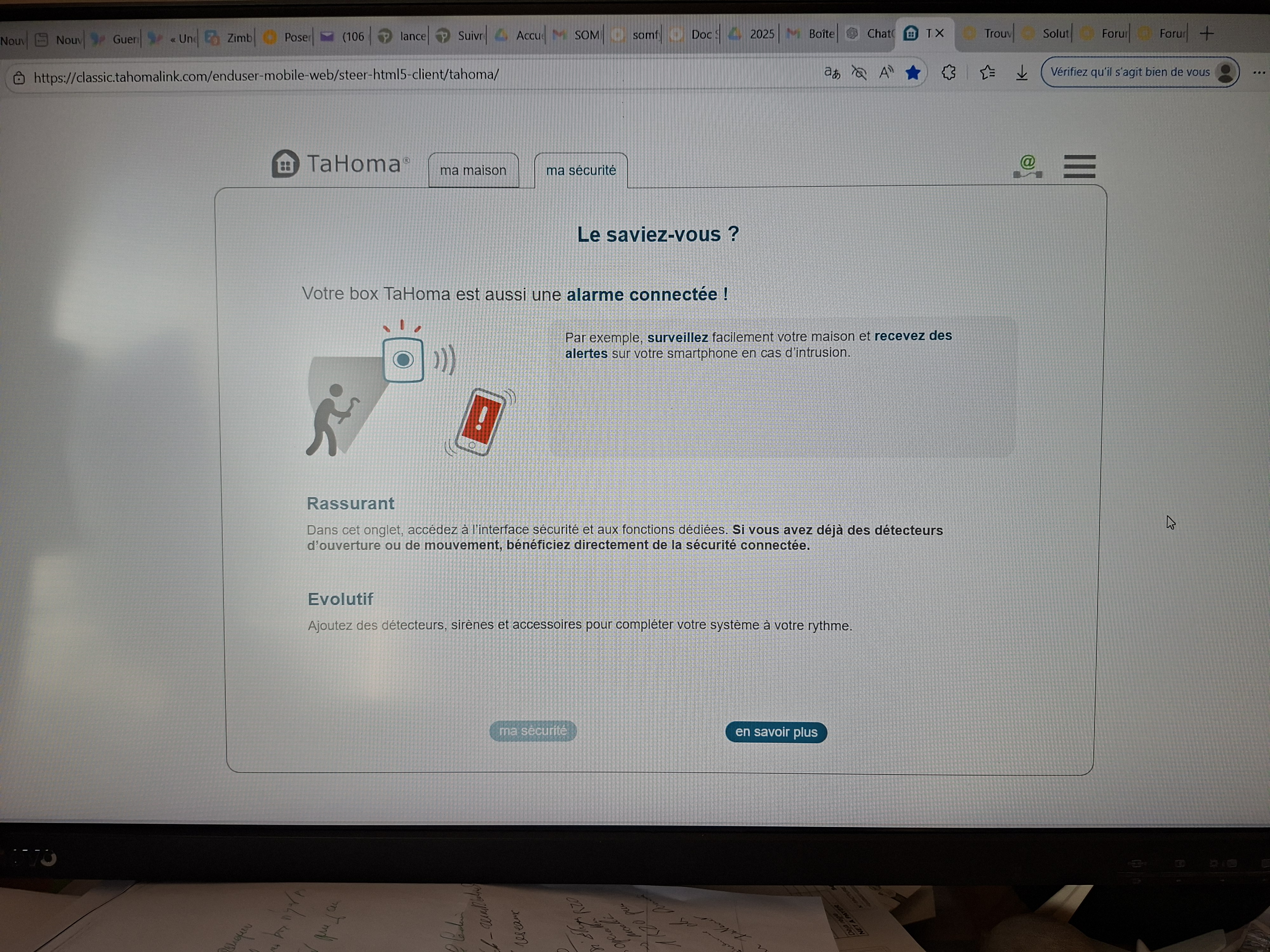 sur SOMFY PROTECT je ne vois que mon systeme d'alarme (pas de contrôle pour mes volets) et sur le site je ne vois que mes volets ET mes caméras (mais pas l'alarme), il y a bien l'onglet ma sécurité mais ...!!???.