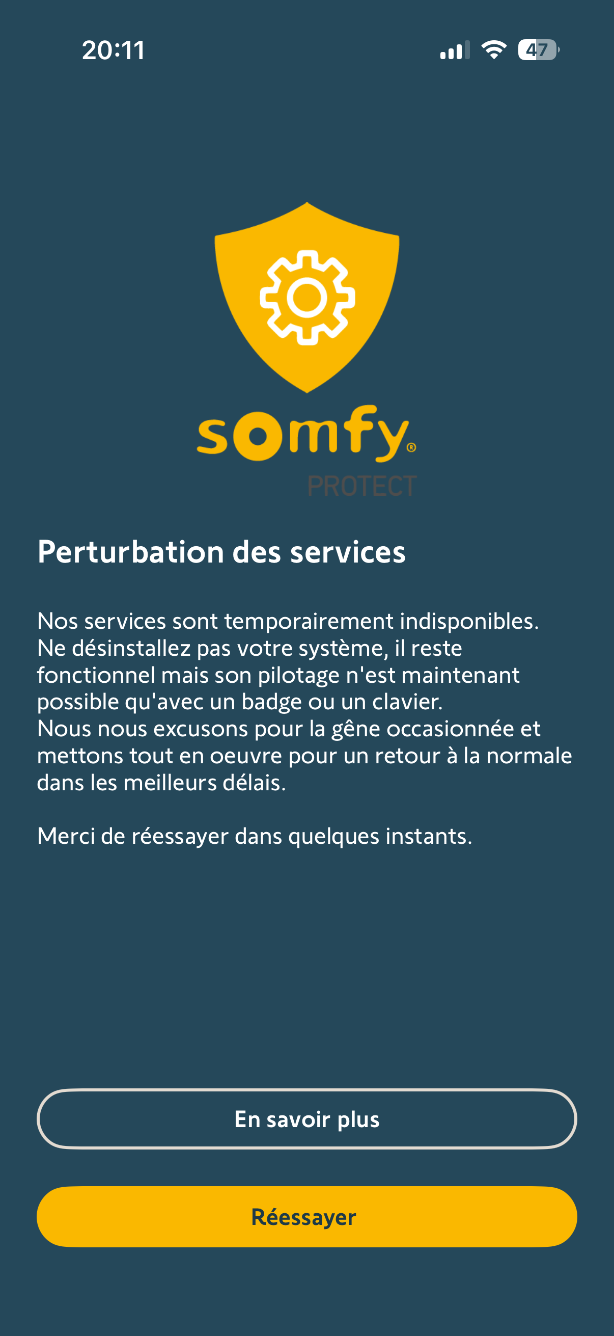 Depuis plusieurs mois j’ai aléatoirement ce message quand je lance Somfy Protect. J’ai essayé de regarder plusieurs topics sur ce sujet. Malgré les actions réalisées, j’ai toujours ce message régulièrement. Est ce réellement un problème chez somfy ou un défaut de mon installation ?