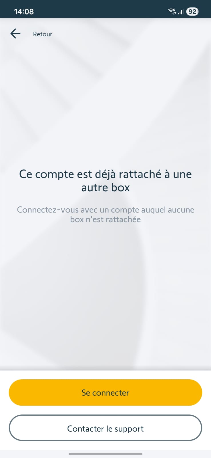 Sur le smartphone de mon fils, j'installe Tahoma et je clique sur le lien de partage, je rente l'email et le mot de passe (compte Somfy protect déjà existant) et là j'ai le message suivant : ce compte est déjà rattaché à une autre box (c'est impossible)