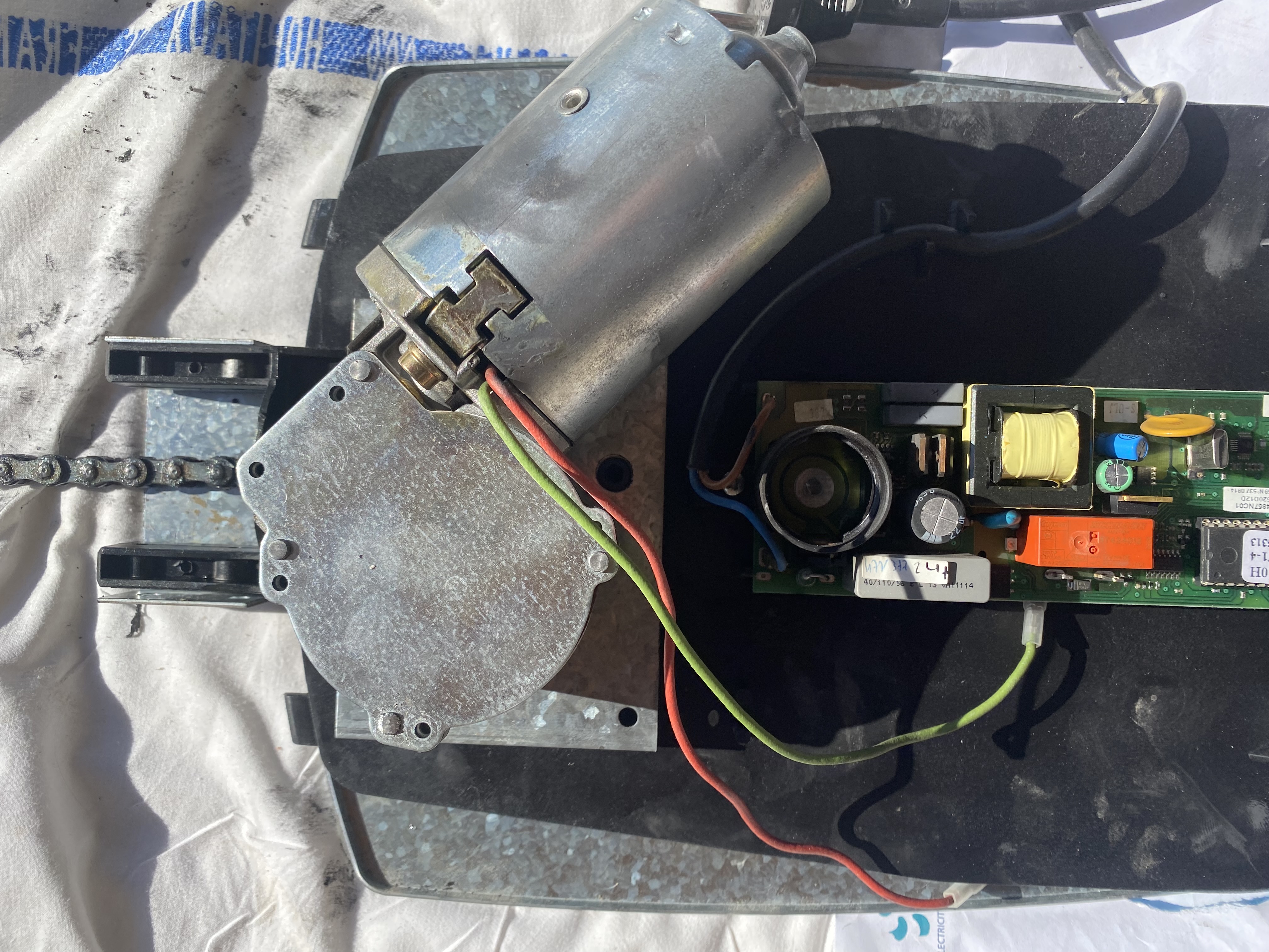 Le moteur fait un bruit affreux et n’entraîne plus la porte, si j’aide un peu la porte à monter elle monte un peu grâce au moteur mais l’énorme bruit revient rapidement et la porte s’immobilise. En lisant les nombreux commentaires j’ai réussi à démonter l’ensemble mais je n’arrive pas à démonter le moteur lui même ni à désolidariser la poulie(?) de l’axe .