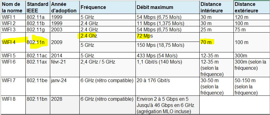 René, sachez que le débit maximum du wifi 4 utilisé par la caméra est 72méga (voir tableau des normes ci joint) et que par expérience ce débit n'est atteint qu'avec une ligne fibre dont le débit est supérieur à 1 giga bit ce qui est loin d'être votre cas.