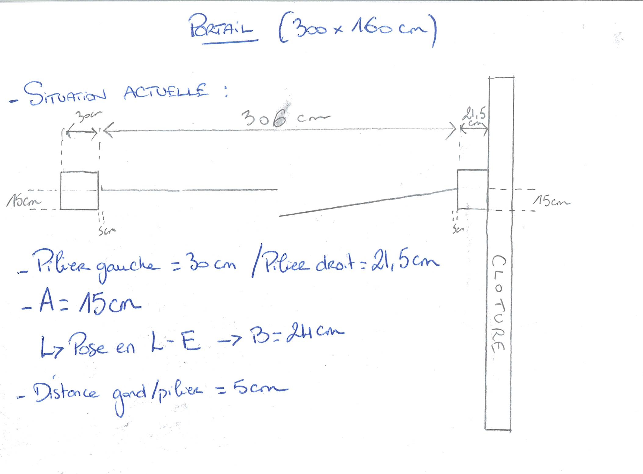 Sachant que la distance entre l'axe du gond du portail est de 5cm, existe-t-il peut-être une adaptation possible pour une pose dans cette configuration ? Si je pose en respectant les cotes communiques, je peux fixer l'équerre de la patte au pilier droit, mais la rallonge frotte le mur perpendiculaire.