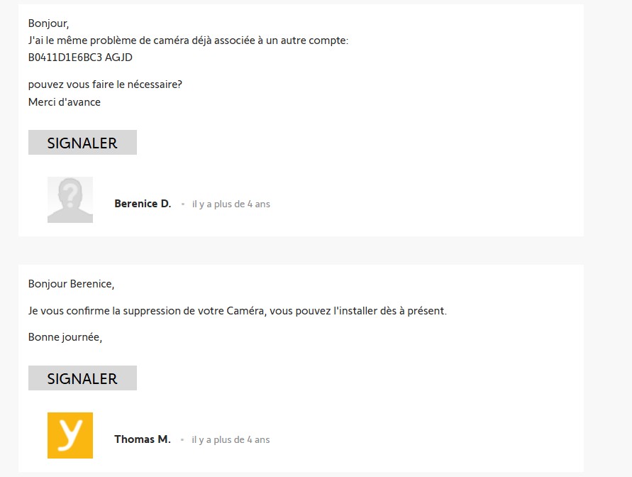 Une caméra que j'avais sur mon ancien wifi dans mon ancien logement (pas utilisées cependant depuis plus de 3ans) et une autre achetée d'occasion (plus de contact avec le prioriétaire) ne peuvent etre installées, le message déjà installé sur un autre site.