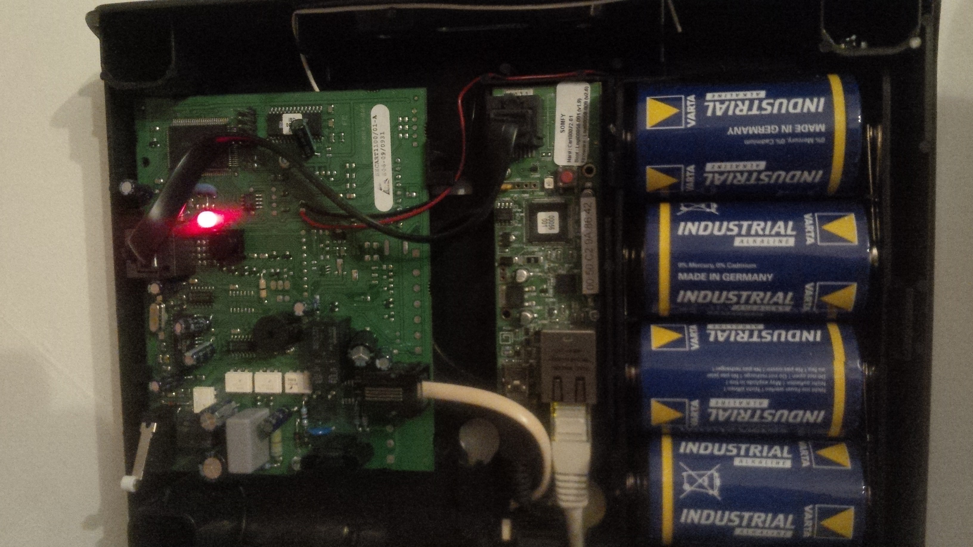bonjour, comme convenu la photo de l'intérieur de ma centrale. Donc un gros bouton noir sous le voyant à gauche et un petit rouge en haut a droite près des piles. Merci de vos réflexions. alan