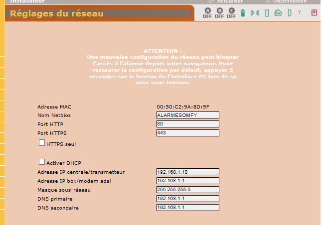 Bonjour, j'ai toujours les mêmes problèmes de conflit entre les codes de cartes même en faisant mise à jour serveur dans le menu carte d'authentification. (voir mon précédent message et sa réponse) J'ai aussi une erreur DNS. Voici les captures d'écran des réglages de la centrale, je ne sais pas si je peux mettre sur le forum les captures d'écran des réglages de ma LiveBox 2 ZTE pour raison de sécurité ? Mon système fonctionne en alarme mais c'est la vraie galère pour les réglages de communication, il est loin le temps où on parlait de plug & play!