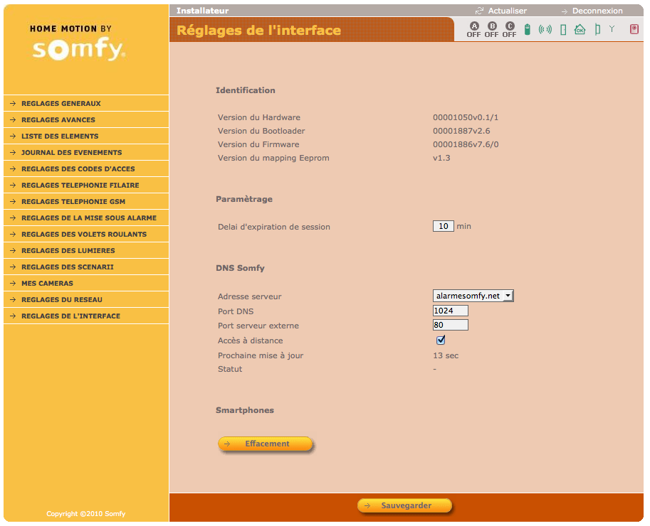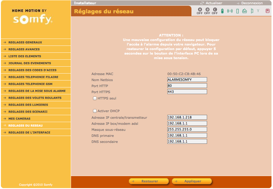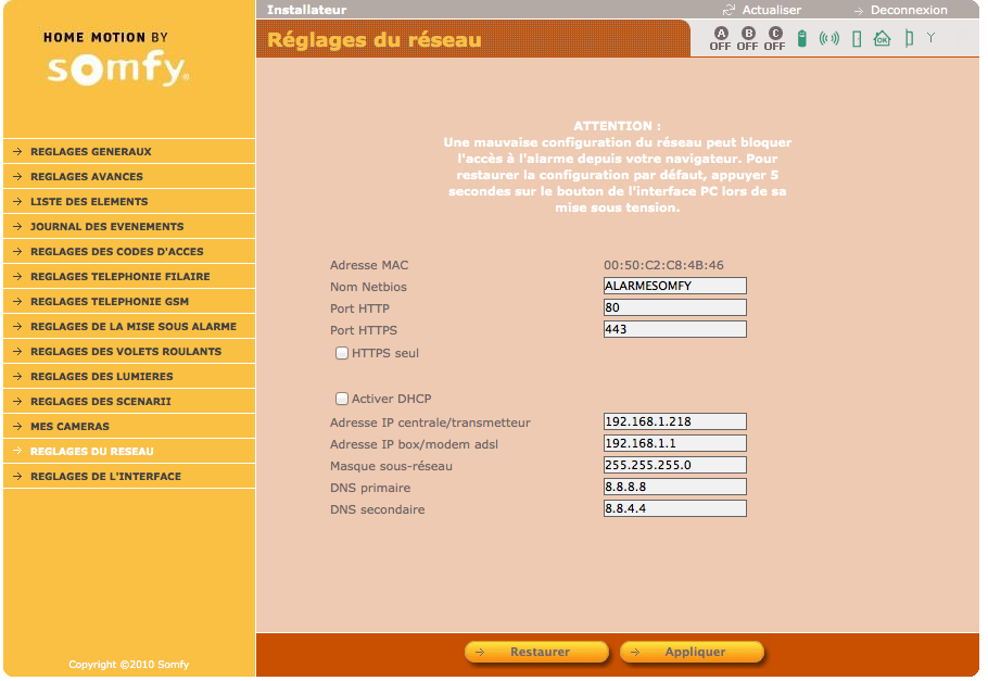 l'interface SOMFY m'indique que la centrale est "ouverte" ? et que j'ai un "defaut de serveur DNS" ?